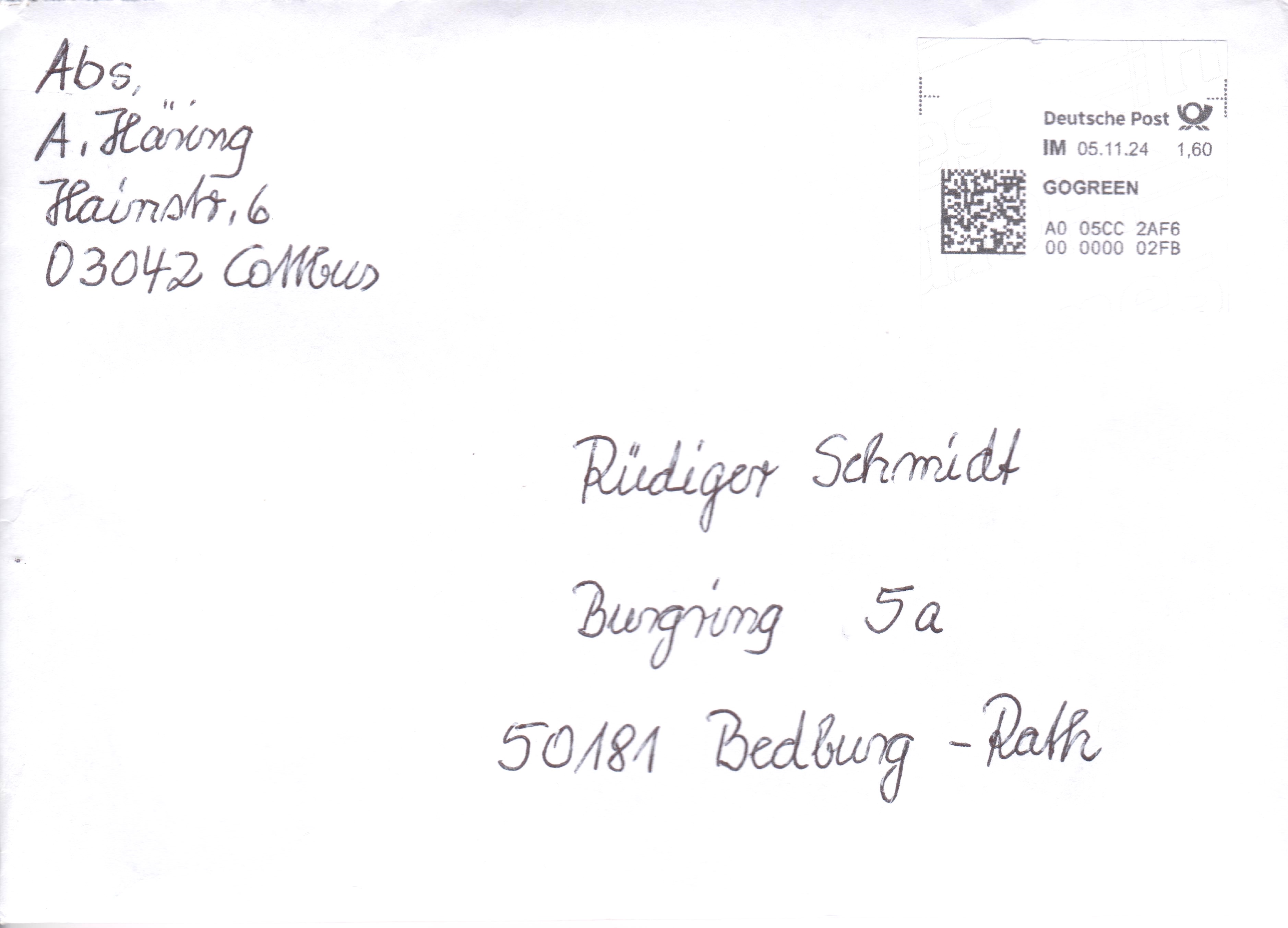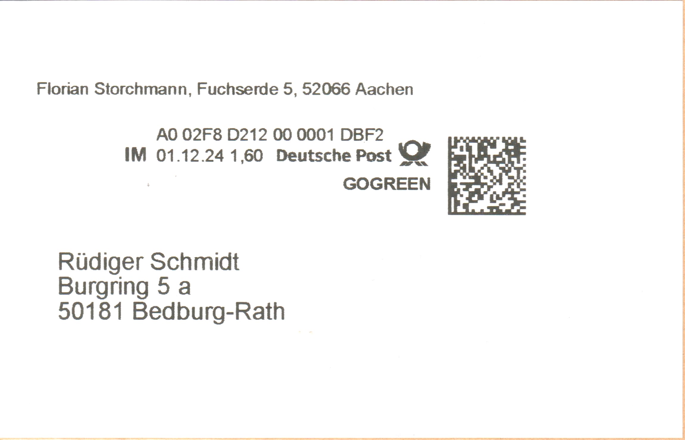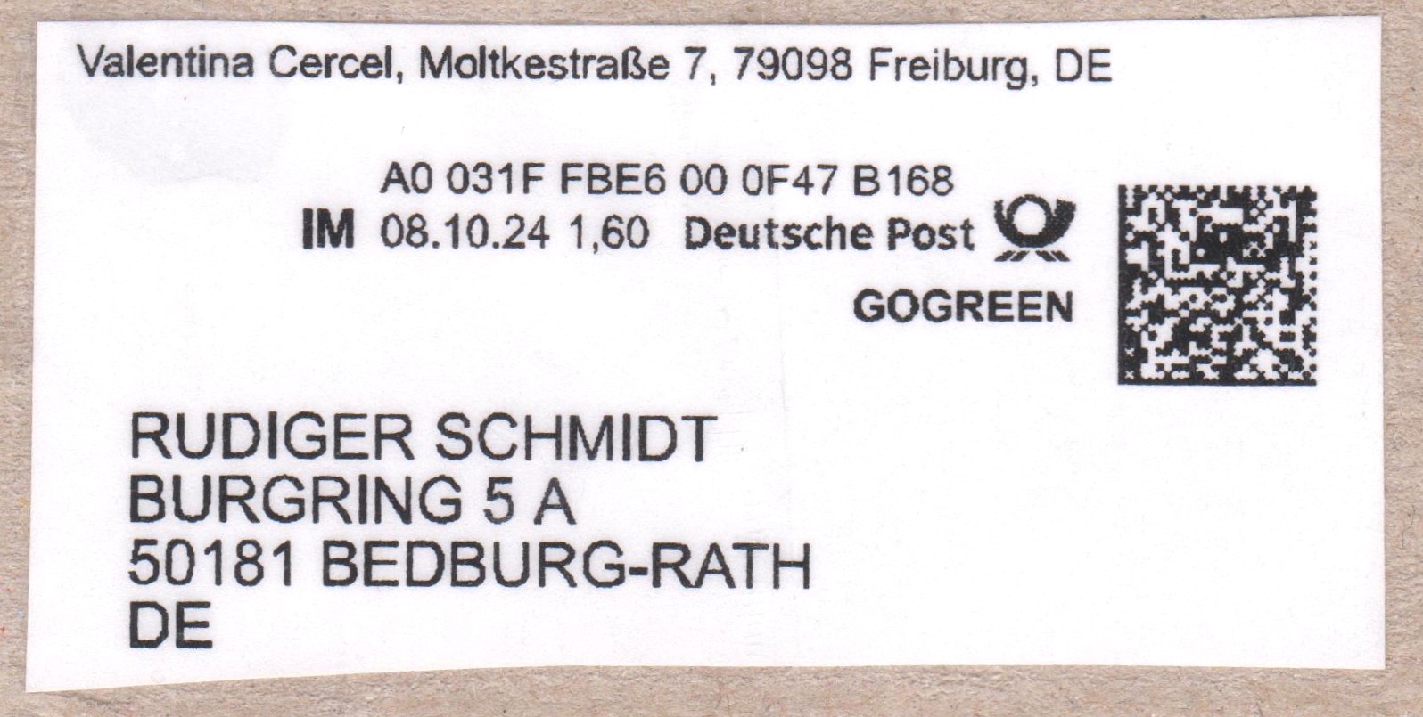 Internetmarke = "IM" am 08.10.2024 auf Brief = Portostufe 1,60 € mit Zusatz GOGREEN: