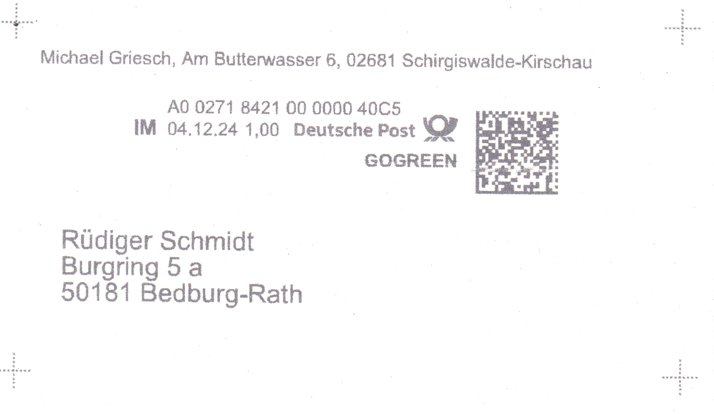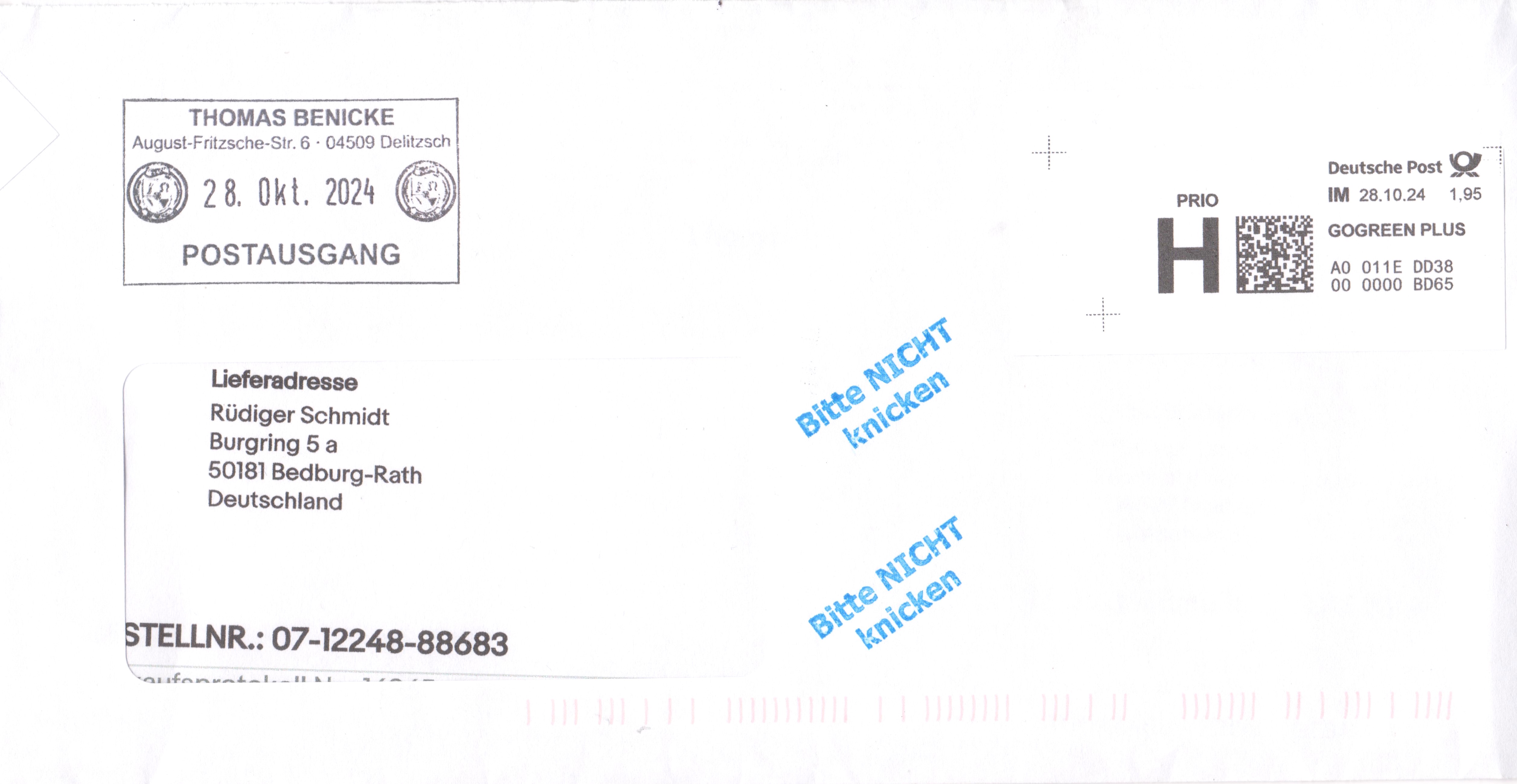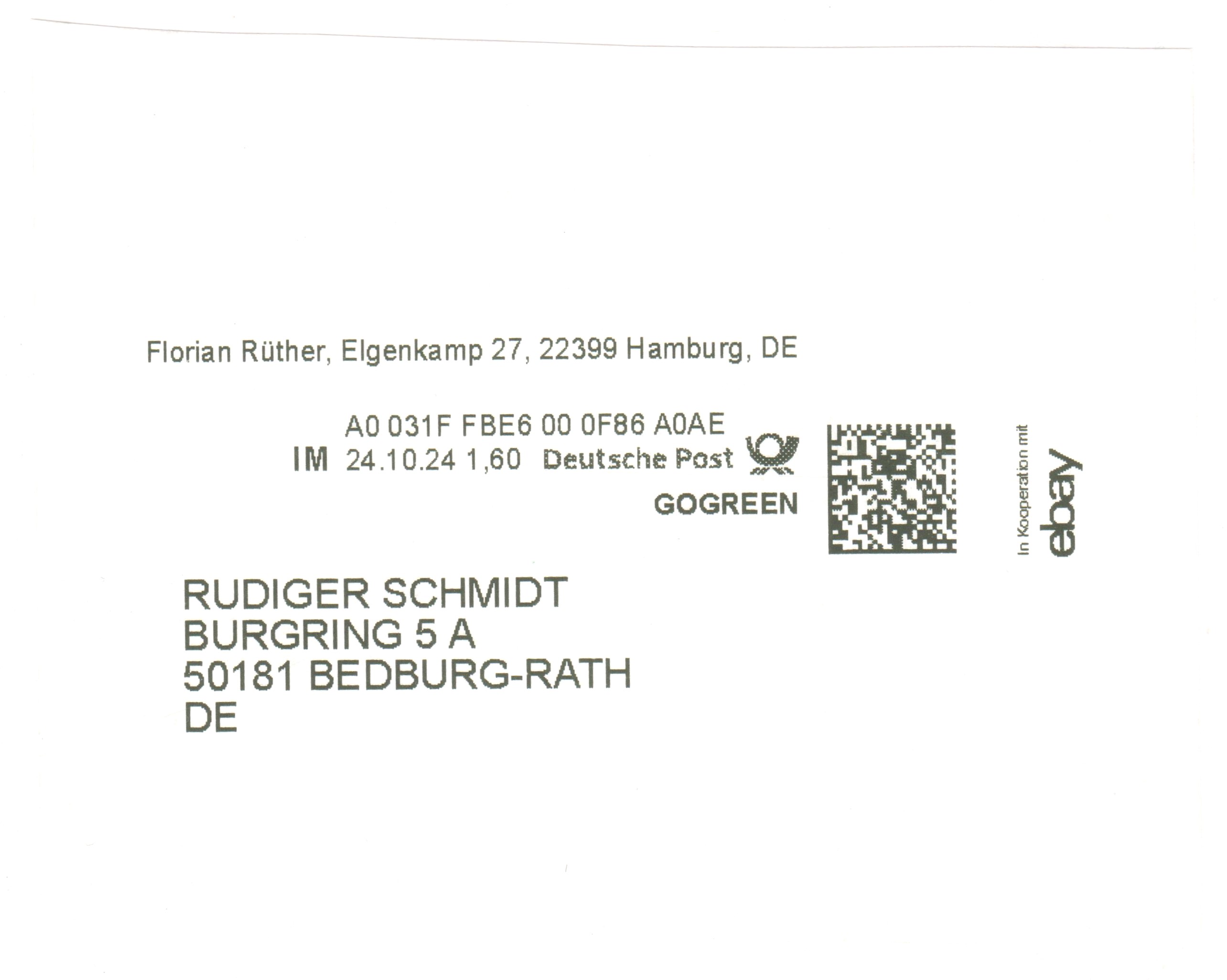 Internetmarke = "IM" am 08.10.2024 auf Brief = Portostufe 1,60 € mit Zusatz GOGREEN: