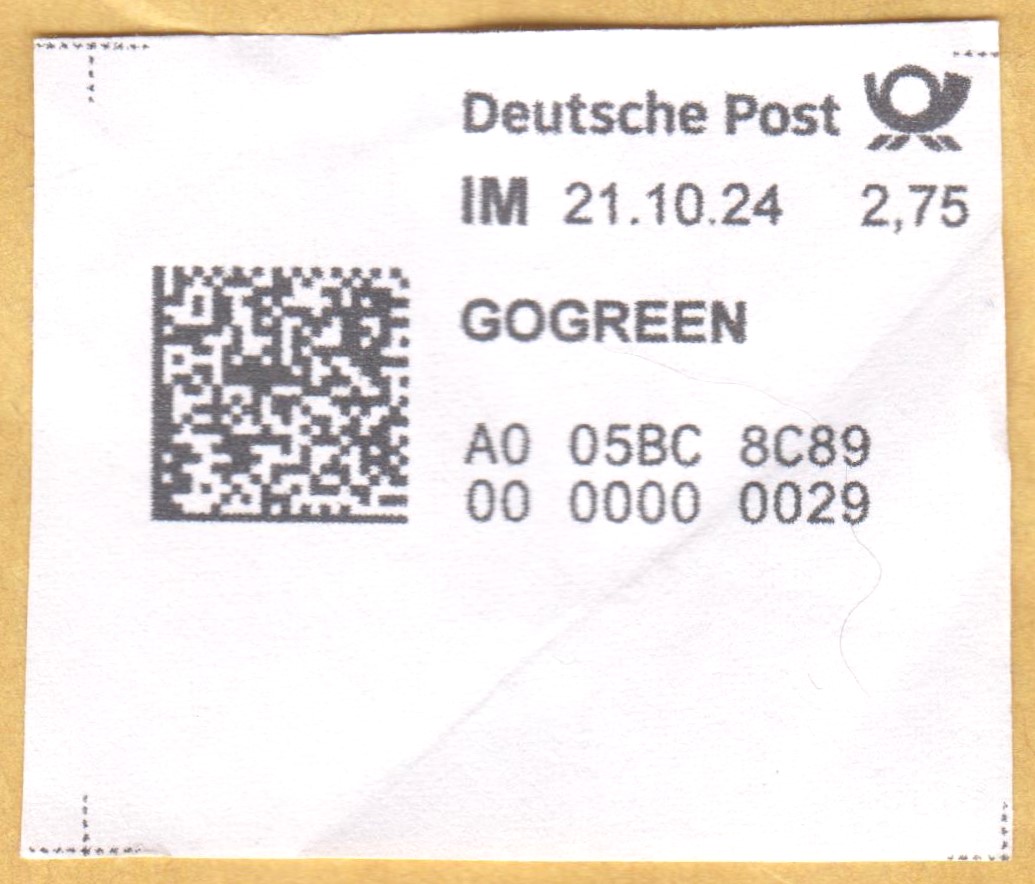 Internetmarke = "IM" am 21.10.2024, Portostufe 2,75 € mit Zusatz GOGREEN:
