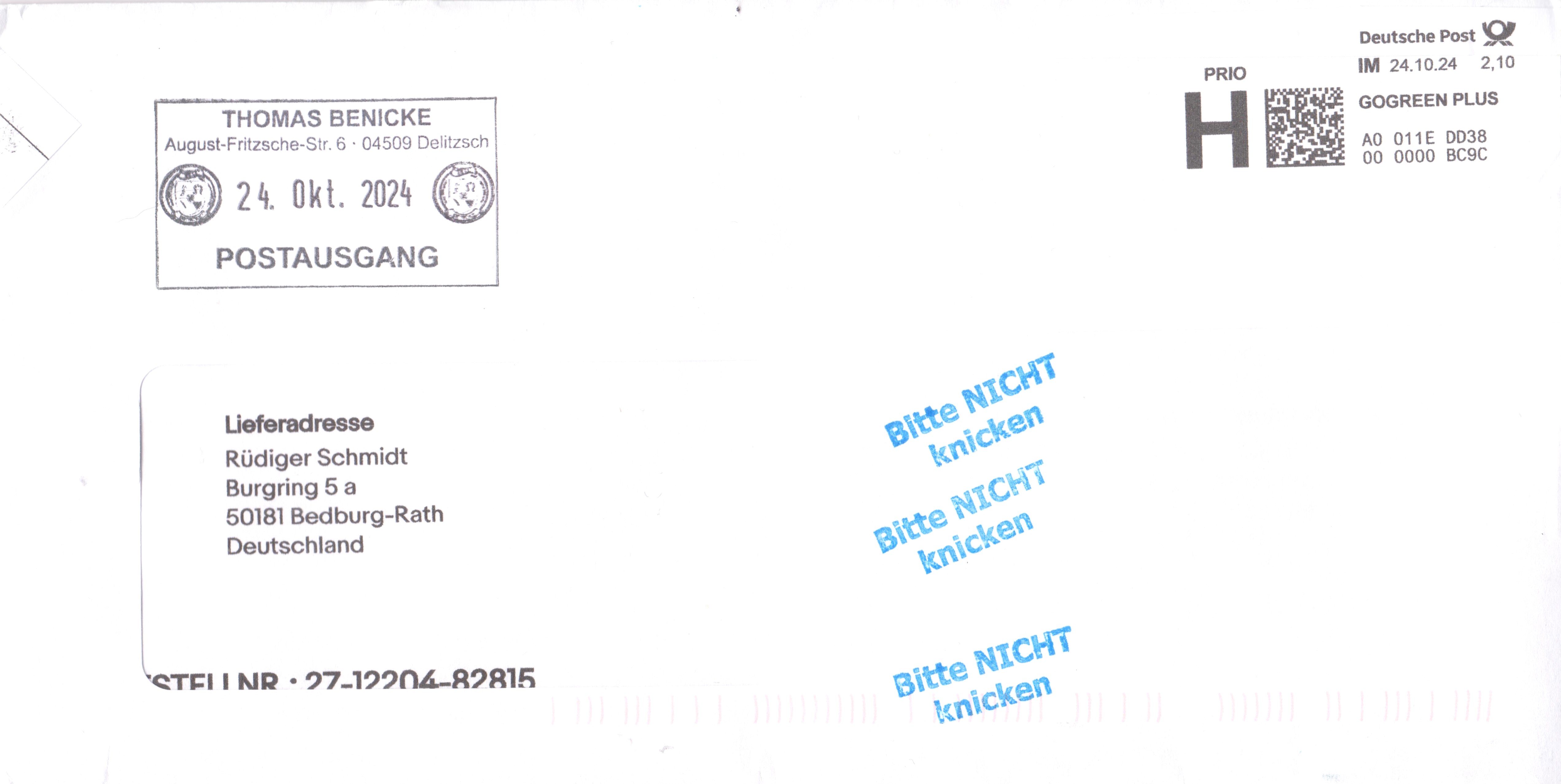 Brief mit PRIO H Label mit Wertangabe 2,70 vom 27.08.24: