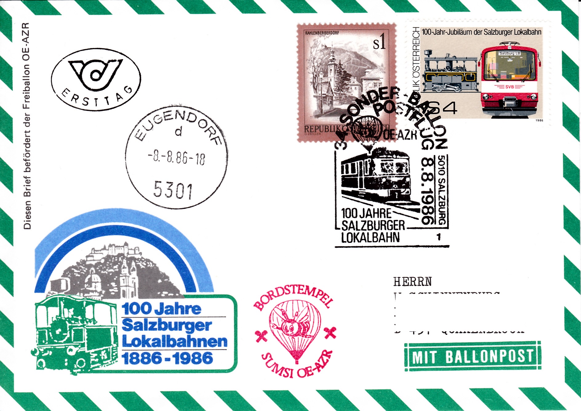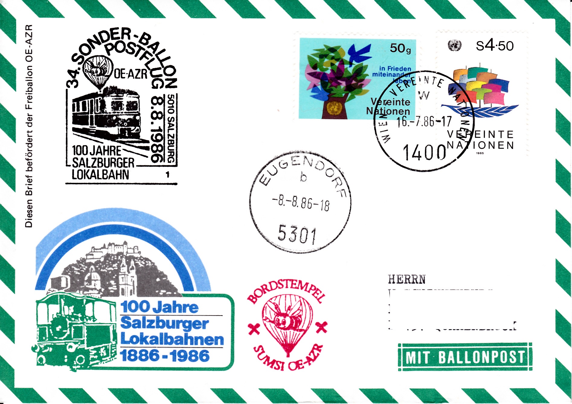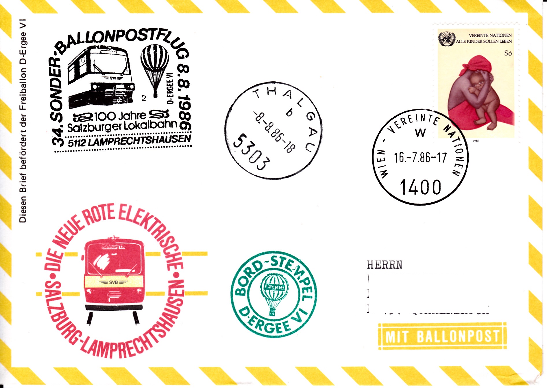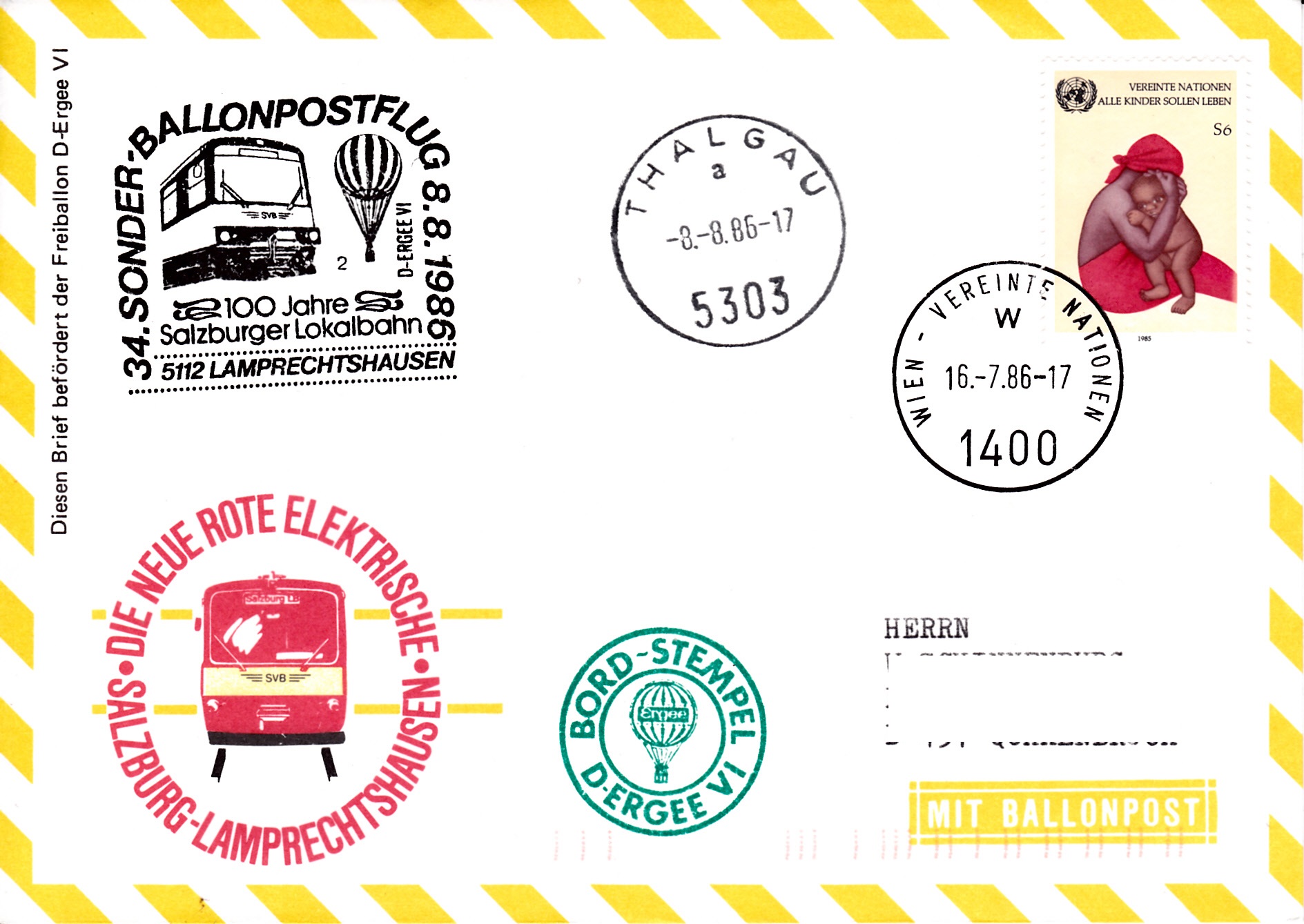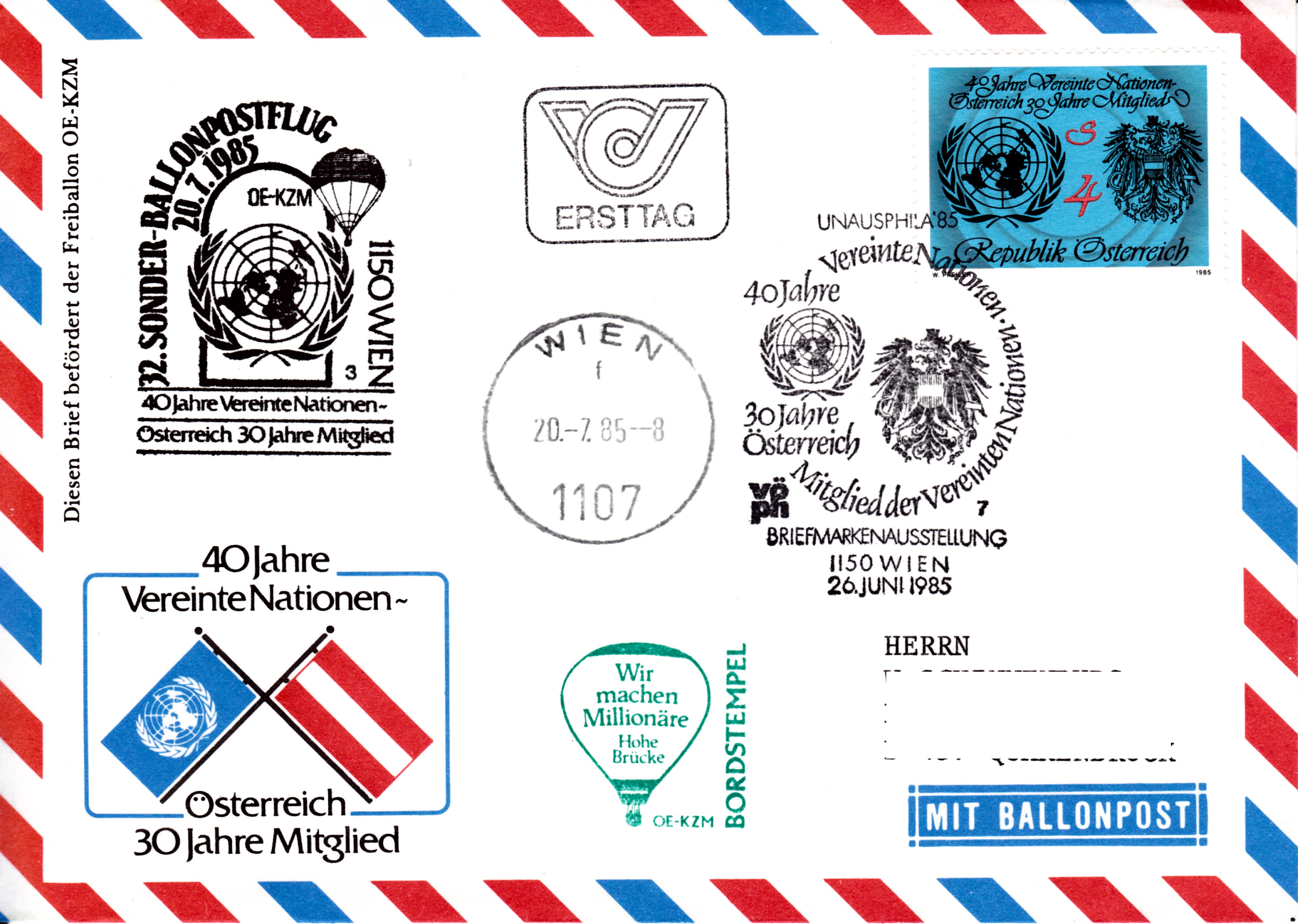 Dieser Brief wurde am 31.7.1987 bei der UN-Postverwaltung Wien für den 35. Sonder-Ballonpostflug der Österreichischen Pro Juventute mit dem Freiballon OE-DZE aufgegeben und mit einem Tagesstempel Wien-Vereinte Nationen gestempelt. Am 5.9.1987 wurde er mit dem Freiballon OE-DZE befördert. Der Brief erhielt an diesem Tag den Sonderstempel aus Rottenmann mit der Kennziffer "4" zu diesem 35. Sonder-Ballonpostflug, einen Tagesstempel Selzthal und einen Bordstempel.