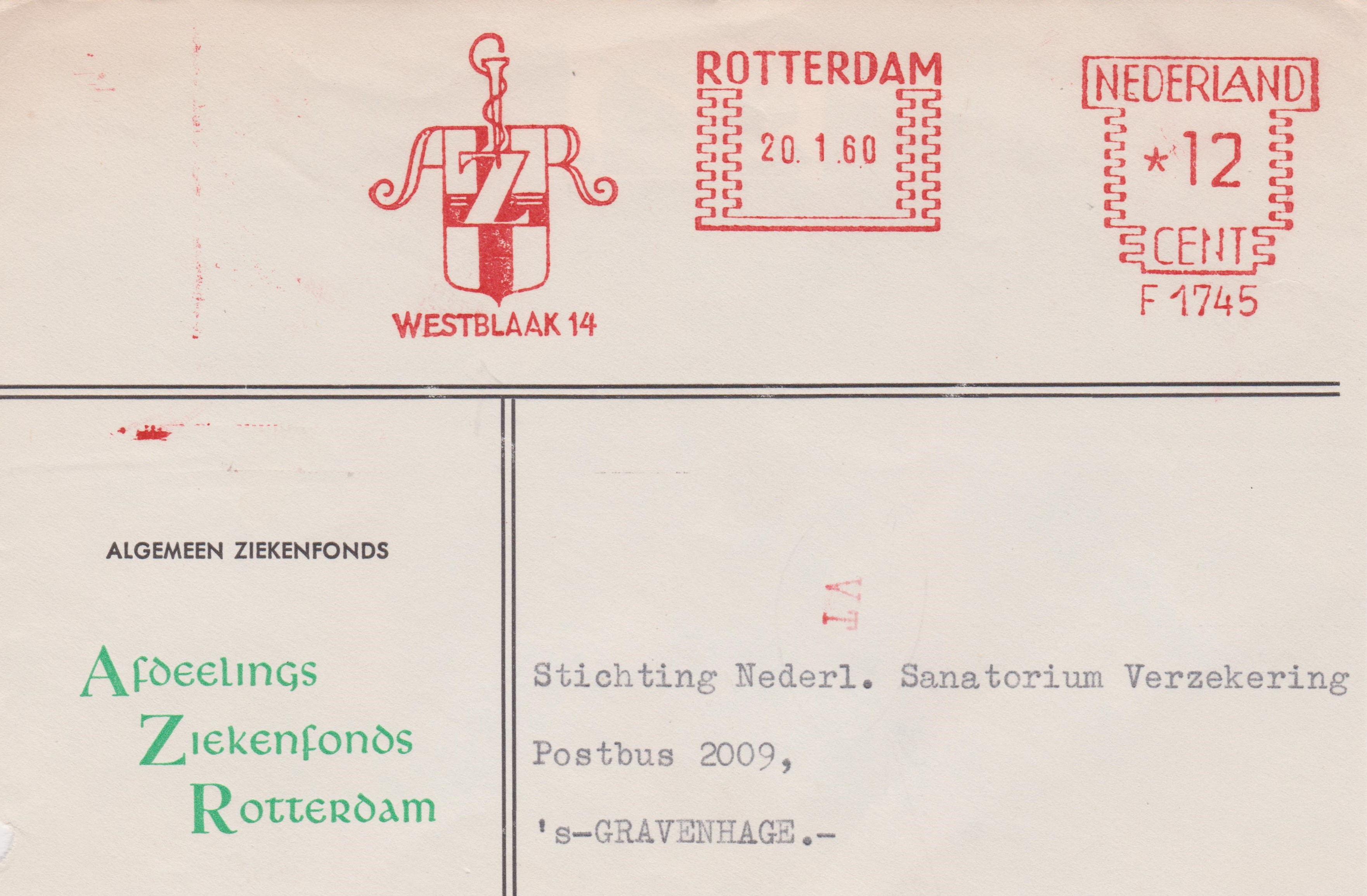 Ausschnitt aus einem Beleg adressiert nach ´s-GRAVENHAGE mit einem Absenderfreistempel vom 20.01.1960 aus ROTTERDAM: