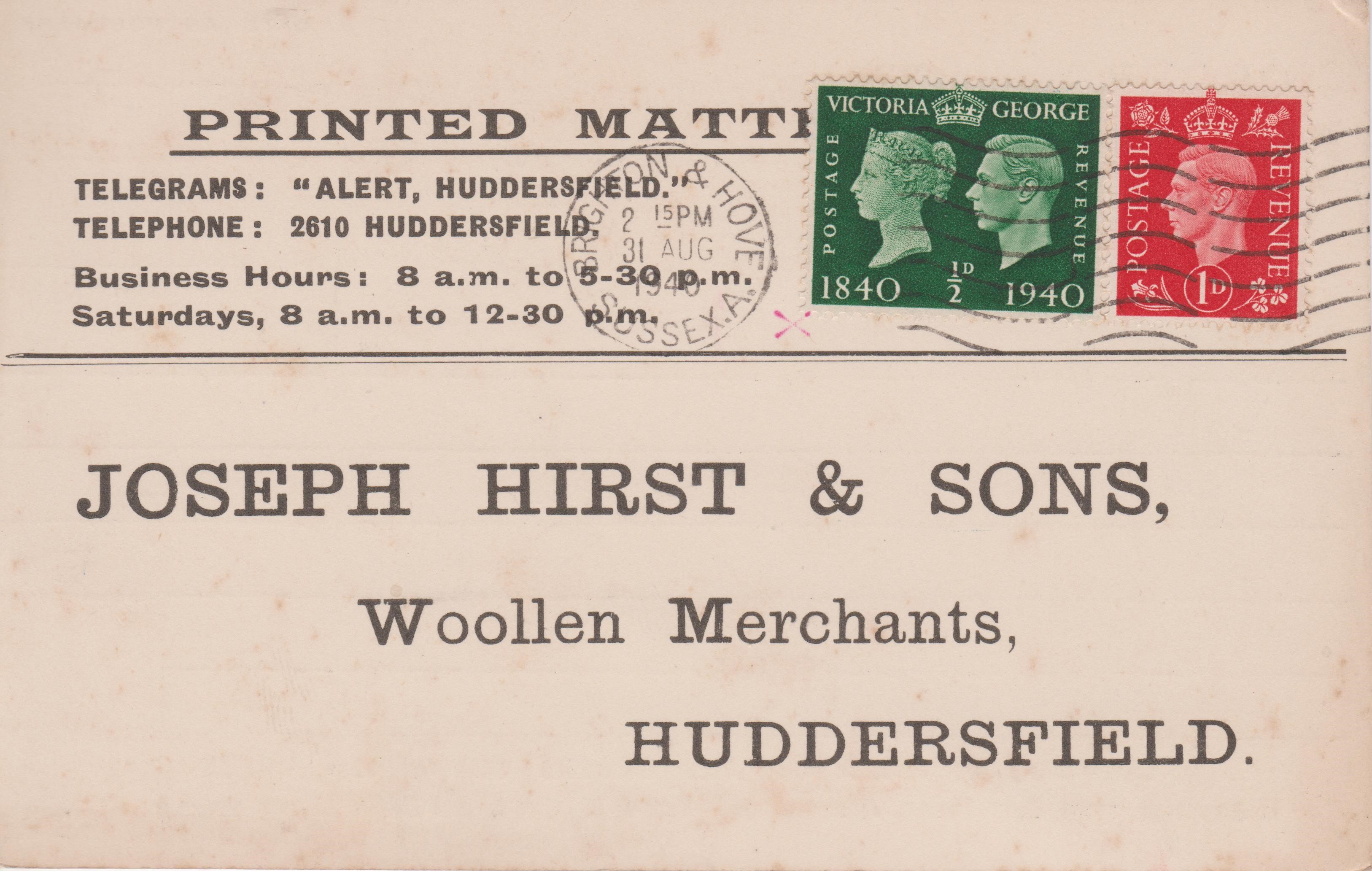 Diese nach "HUDDLEFIELD" adressierte Postkarte wurde am 31.08.1940 in BRIGHTON in GB aufgegeben: