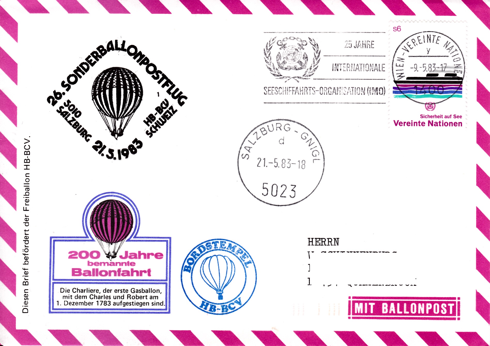 Dieser Brief wurde am 9.5.1983 bei der UN-Postverwaltung Wien für den 26. Sonder-Ballonpostflug der Österreichischen Pro Juventute mit dem Freiballon HB-BCV aufgegeben und mit einem Maschinenstempel Wien-Vereinte Nationen gestempelt. Am 21.5.1983 wurde er mit dem Freiballon HB-BCV befördert. Der Brief erhielt an diesem Tag den Sonderstempel aus Salzburg mit der Kennziffer "1" zu diesem 26. Sonder-Ballonpostflug, einen Tagesstempel aus Salzburg-Gnigl und einen Bordstempel.