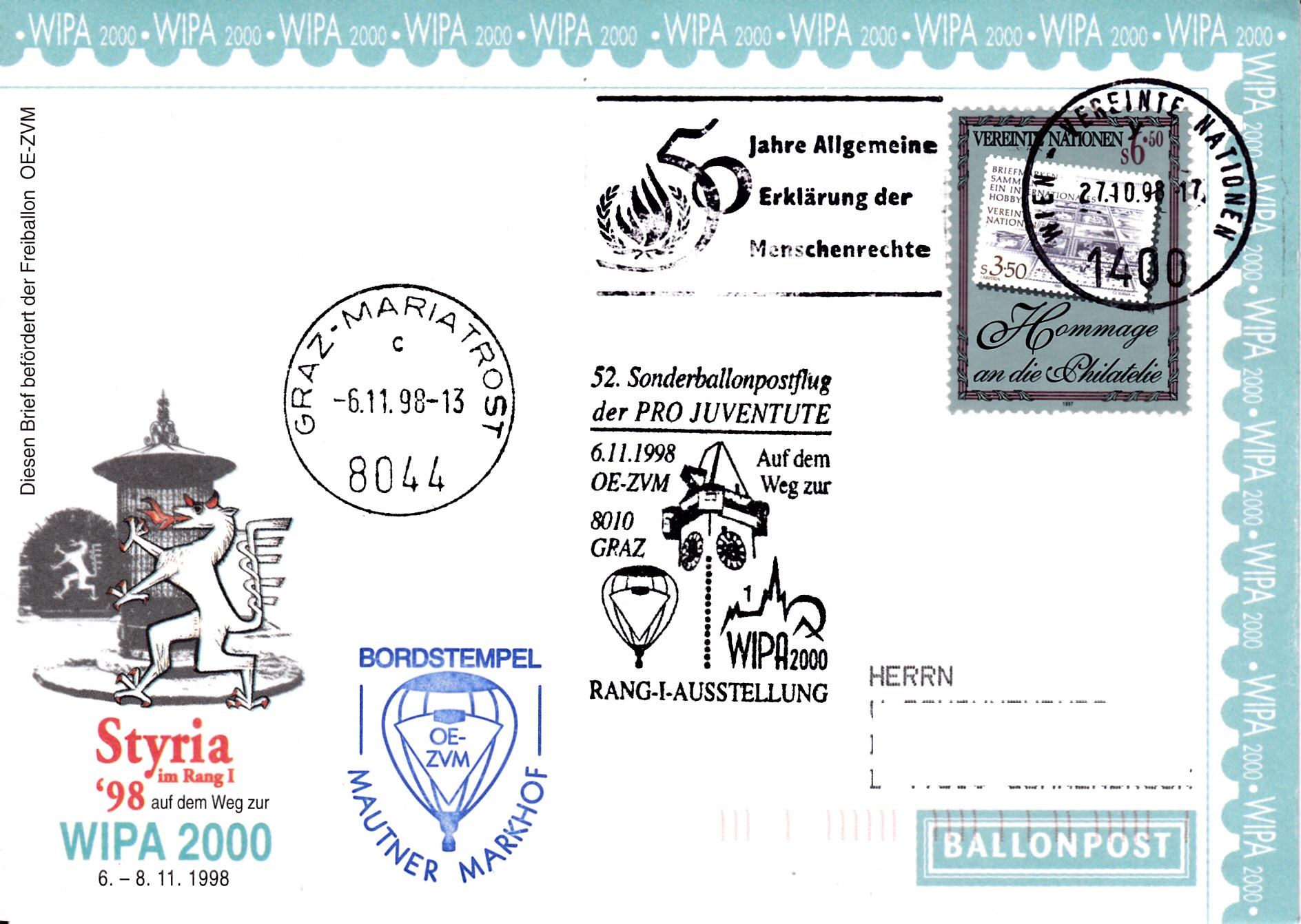 Dieser Brief wurde am 27.10.1998 bei der UN-Postverwaltung Wien für den 52. Sonder-Ballonpostflug der Österreichischen Pro Juventute mit dem Freiballon OE-ZVM aufgegeben und mit einem Maschinenstempel Wien-Vereinte Nationen gestempelt. Am 6.11.1998 wurde er mit dem Freiballon OE-ZVM befördert. Der Brief erhielt an diesem Tag den Sonderstempel aus Graz mit der Kennziffer "1" zu diesem 52. Sonder-Ballonpostflug, einen Tagesstempel aus Graz-Mariatrost und einen Bordstempel.