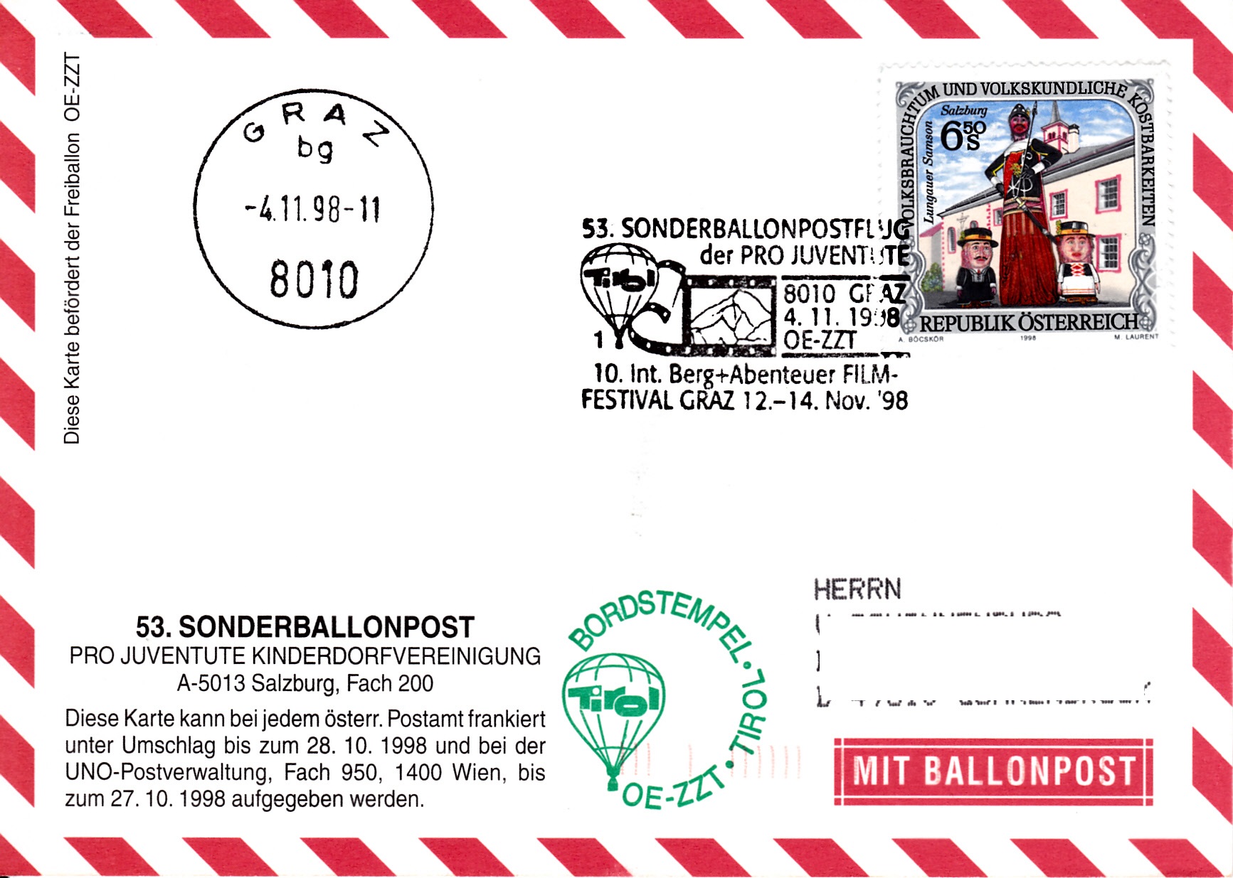 Diese Karte wurde am 4.11.1998 in Graz für den 53. Sonder-Ballonpostflug der Österreichischen Pro Juventute mit dem Freiballon OE-ZZT aufgegeben. Sie erhielt den Sonderstempel mit der Kennziffer "1" aus Graz zu diesem Ballonflug und wurde am gleichen Tag mit dem Freiballon OE-ZZT befördert. Sie erhielt zusätzlich einen Bordstempel und einen Tagesstempel aus Graz.