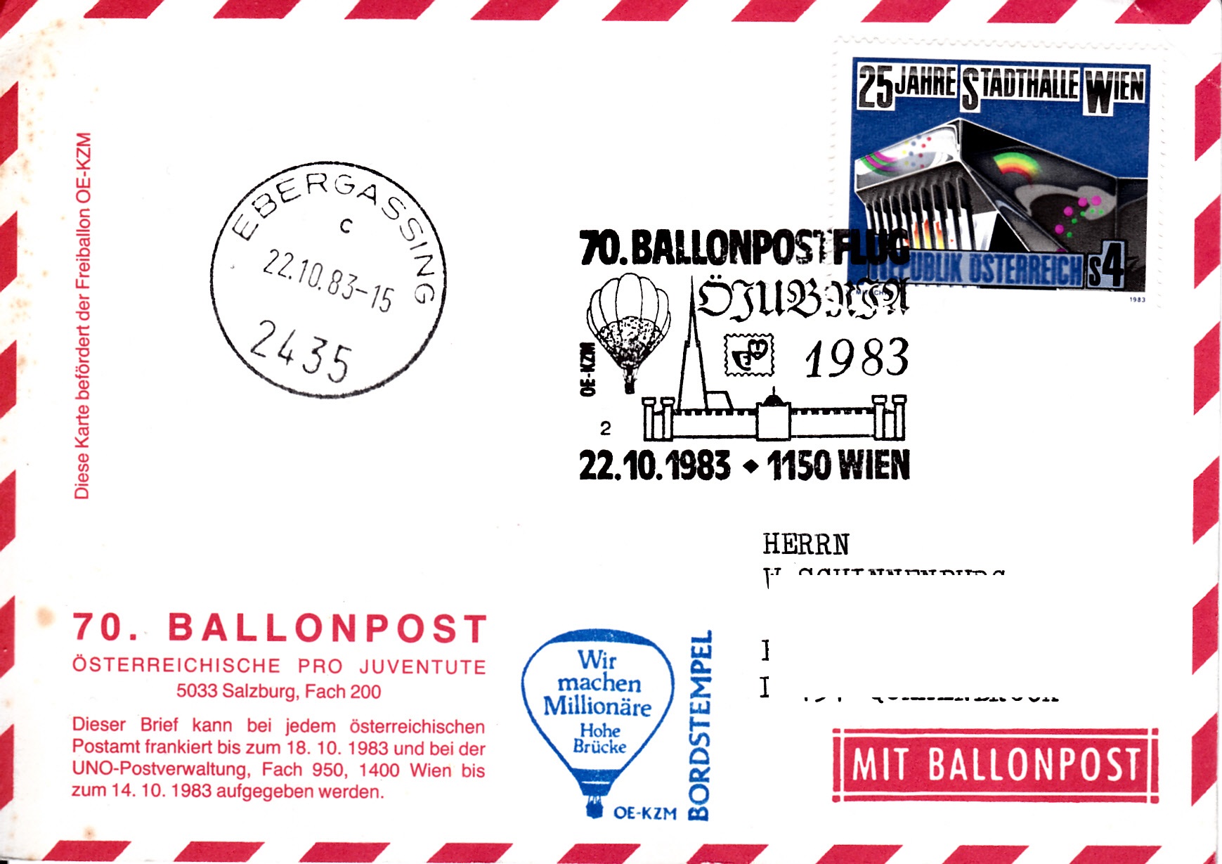 Diese Karte wurde am 22.10.1983 in Wien für den 70. Ballonpostflug der Österreichischen Pro Juventute mit dem Freiballon OE-KZM aufgegeben. Sie erhielt den Sonderstempel mit der Kennziffer "2" aus Wien zu diesem Ballonflug und wurde am gleichen Tag mit dem Freiballon OE-KZM befördert. Sie erhielt zusätzlich einen Bordstempel und einen Tagesstempel aus Ebergassing.