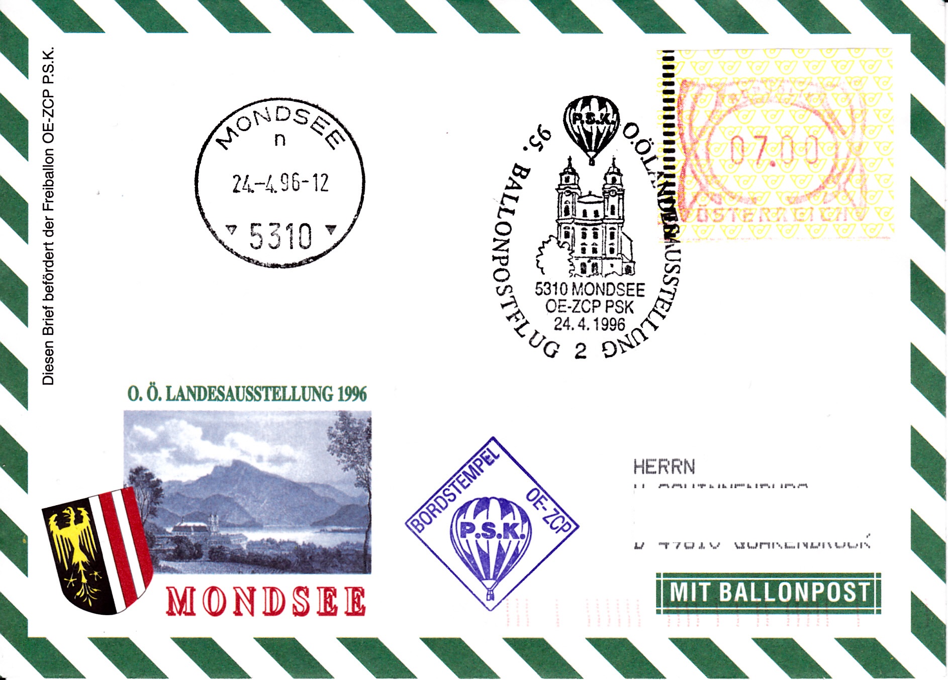 Dieser Brief wurde am 24.4.1996 in Mondsee für den 95. Ballonpostflug der Österreichischen Pro Juventute mit dem Freiballon OE-ZCP aufgegeben. Er erhielt den Sonderstempel mit der Kennziffer "2" aus Mondsee zu diesem Ballonflug und wurde am gleichen Tag mit dem Freiballon OE-ZCP befördert. Er erhielt zusätzlich einen Bordstempel und einen Tagesstempel aus Mondsee.