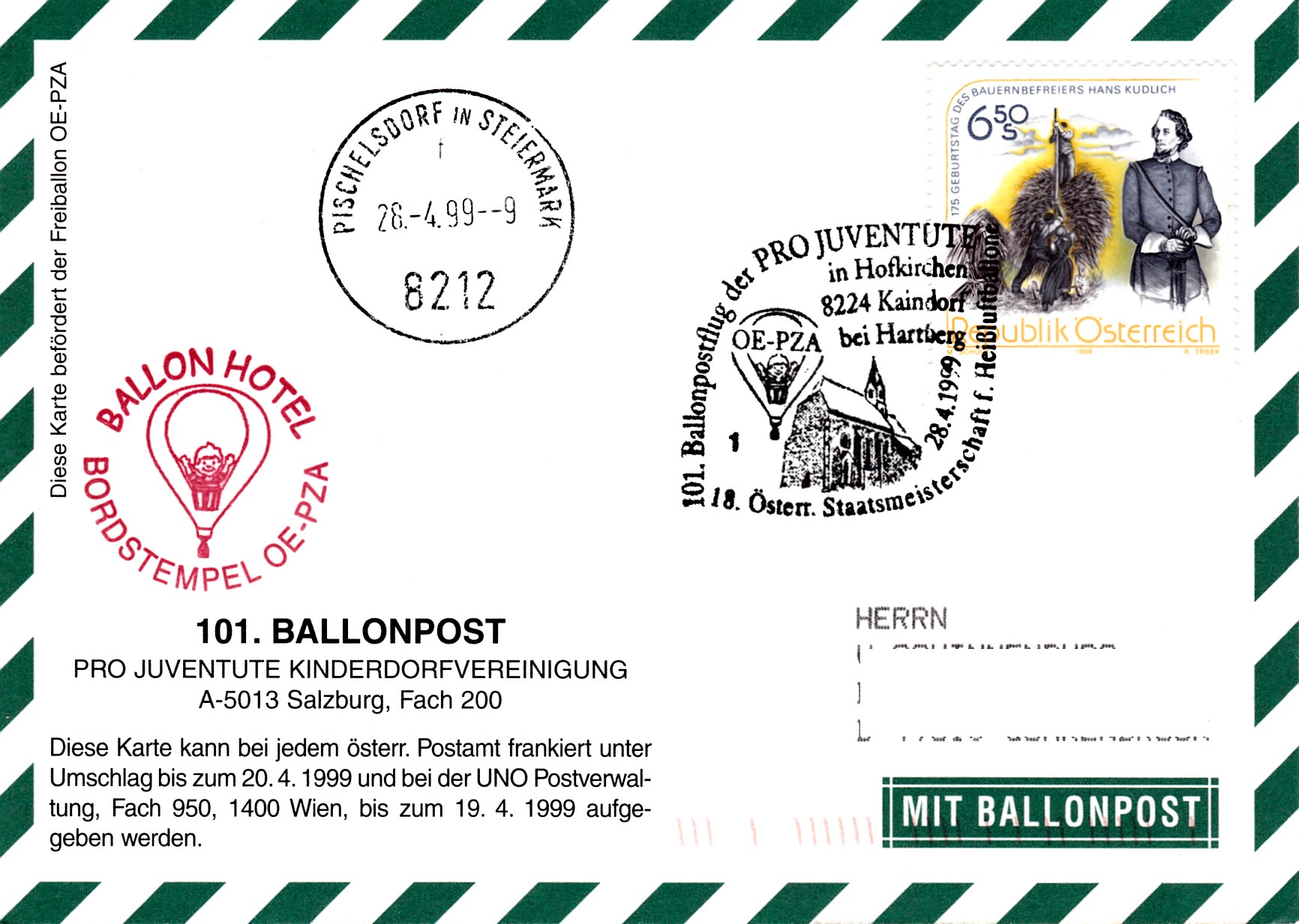Diese Karte wurde am 6.7.1984 in Wien für den 28. Sonder-Ballonpostflug der Österreichischen Pro Juventute mit dem Freiballon OE-KZM aufgegeben. Sie erhielt den Sonderstempel mit der Kennziffer "4" aus Graz zu diesem Ballonflug und wurde am gleichen Tag mit dem Freiballon OE-KZM befördert. Sie erhielt zusätzlich einen Bordstempel, den Stempel "Ersttag" und einen Tagesstempel aus Gross-Enzersdorf.