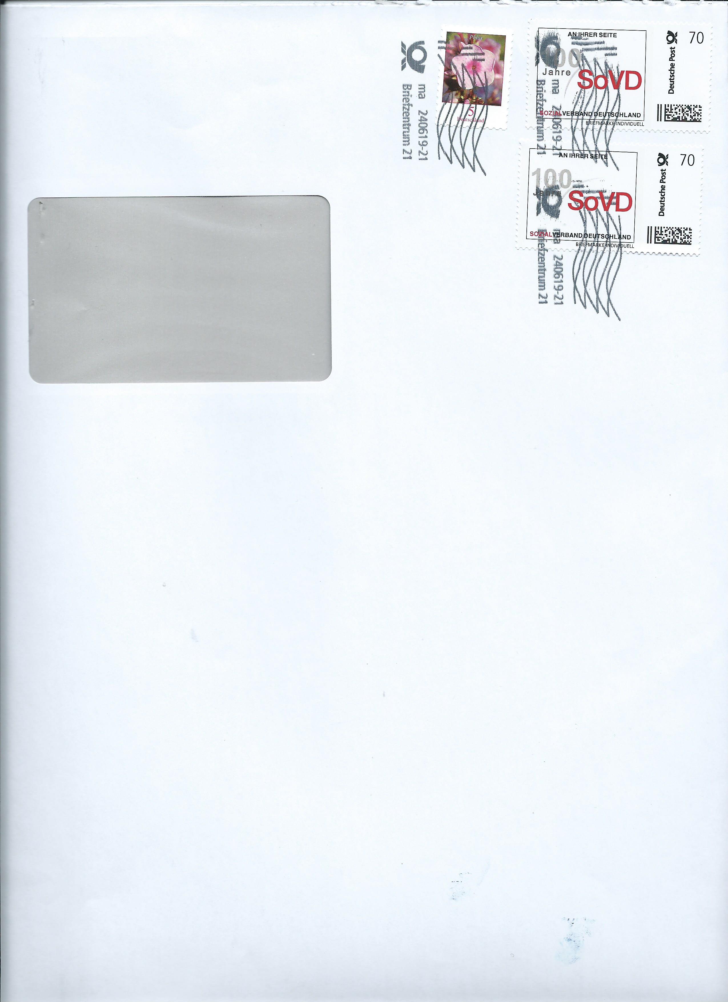 Dann ein Großbrief mit 2 Marken zu 70 Cent mit Motiv 100 Jahre Sozialverband Deutschland und einer Blumenmarke zu 5 Cent. Auch hier wurde mit Tintenstrahlentwertung am 24.6.19 im Briefzentrum 21 „gestempelt“.