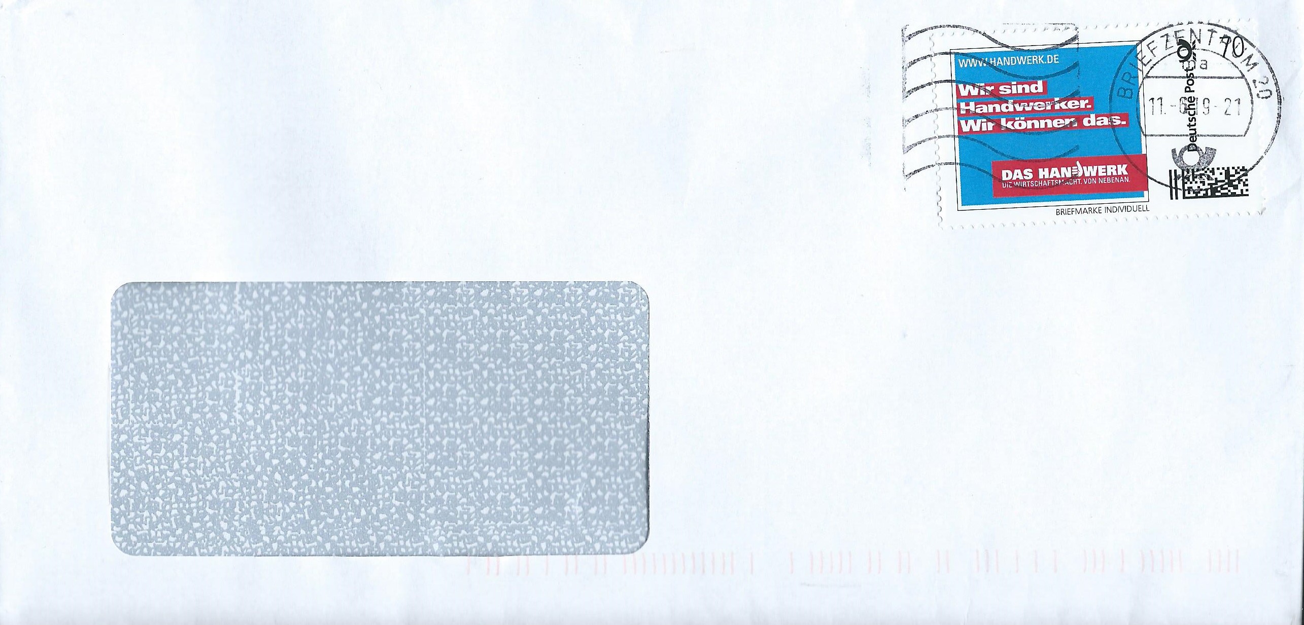 „Wir sind Handwerker, wir können das“, das verrät der folgende Beleg mit einer Marke zu 70 Cent. Der Beleg wurde am 11.6.19 im Briefzentrum 20 gestempelt.