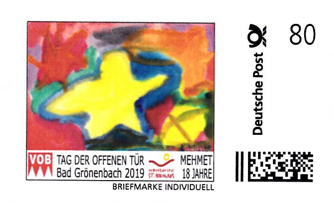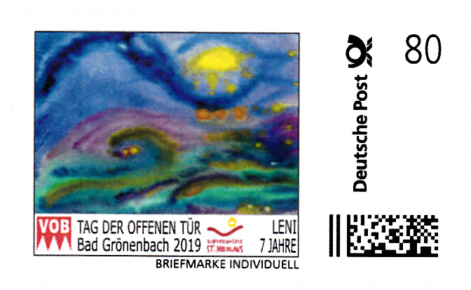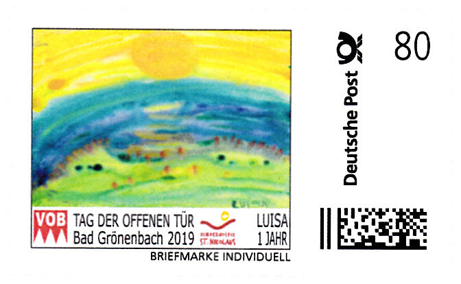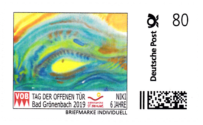 Mit diesem Beitrag beginne ich weitere Marken individuell mit ausgewählten Bildern von Kindern vorzustellen, die im Kinderhospiz St.Nikolaus in Bad Grönenbach bei ihrer Maltherapie entstanden sind. Das Bild auf dieser Marke stammt gemäß Inschrift auf der Marke von einer Einjährigen.