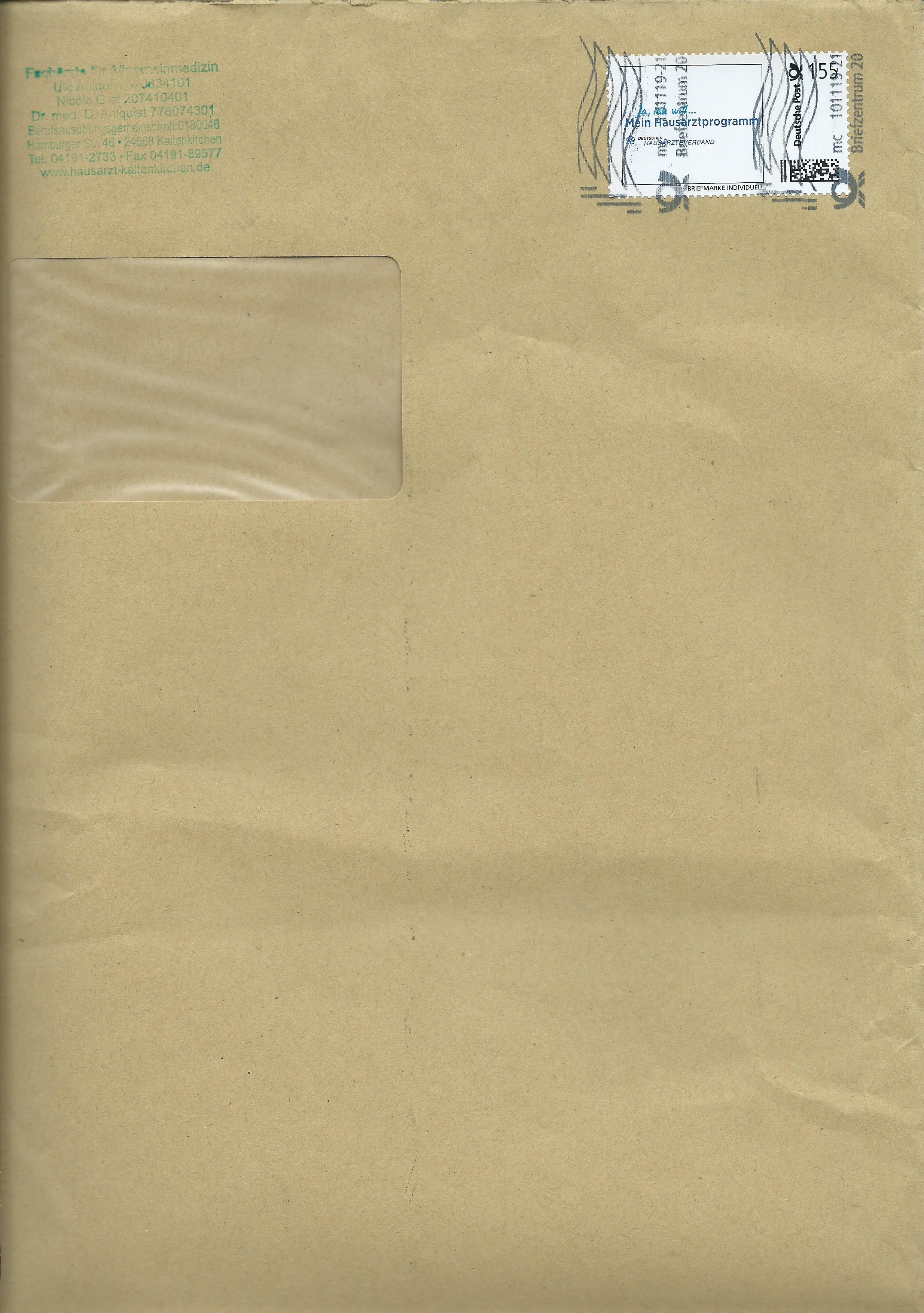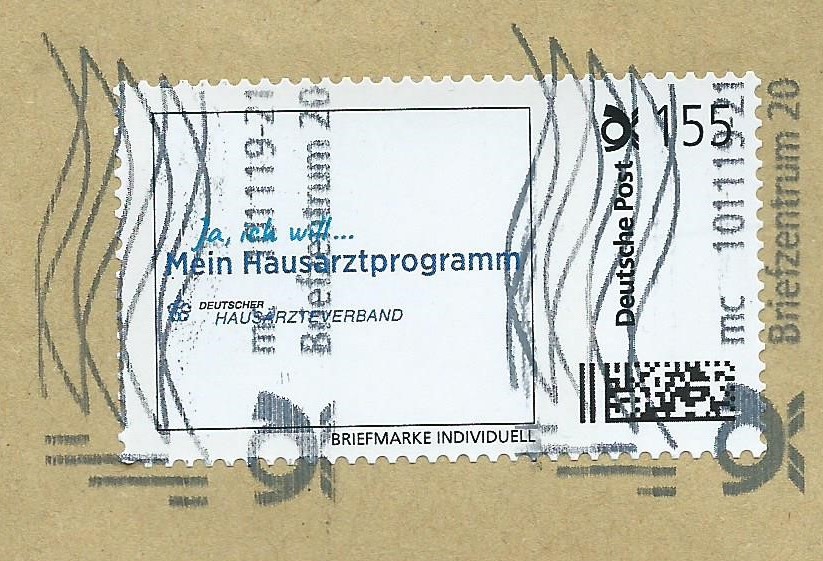 Und einmal ein Wert zu 155 Cent mit dem Motiv „Mein Hausarztprogramm“, gestempelt mit der Tintenstrahlentwertung im Briefzentrum 20 am 10.11.19. Der Umschlag passte nicht komplett auf den Scanner, daher ist er etwas abgeschnitten.