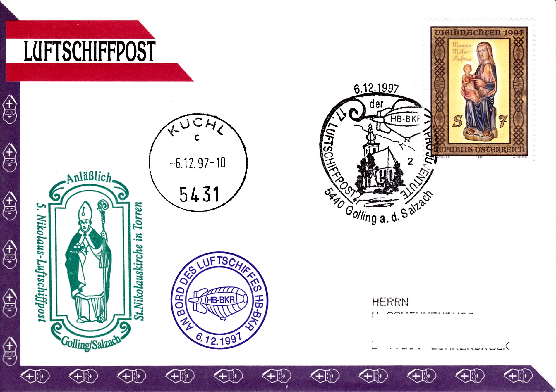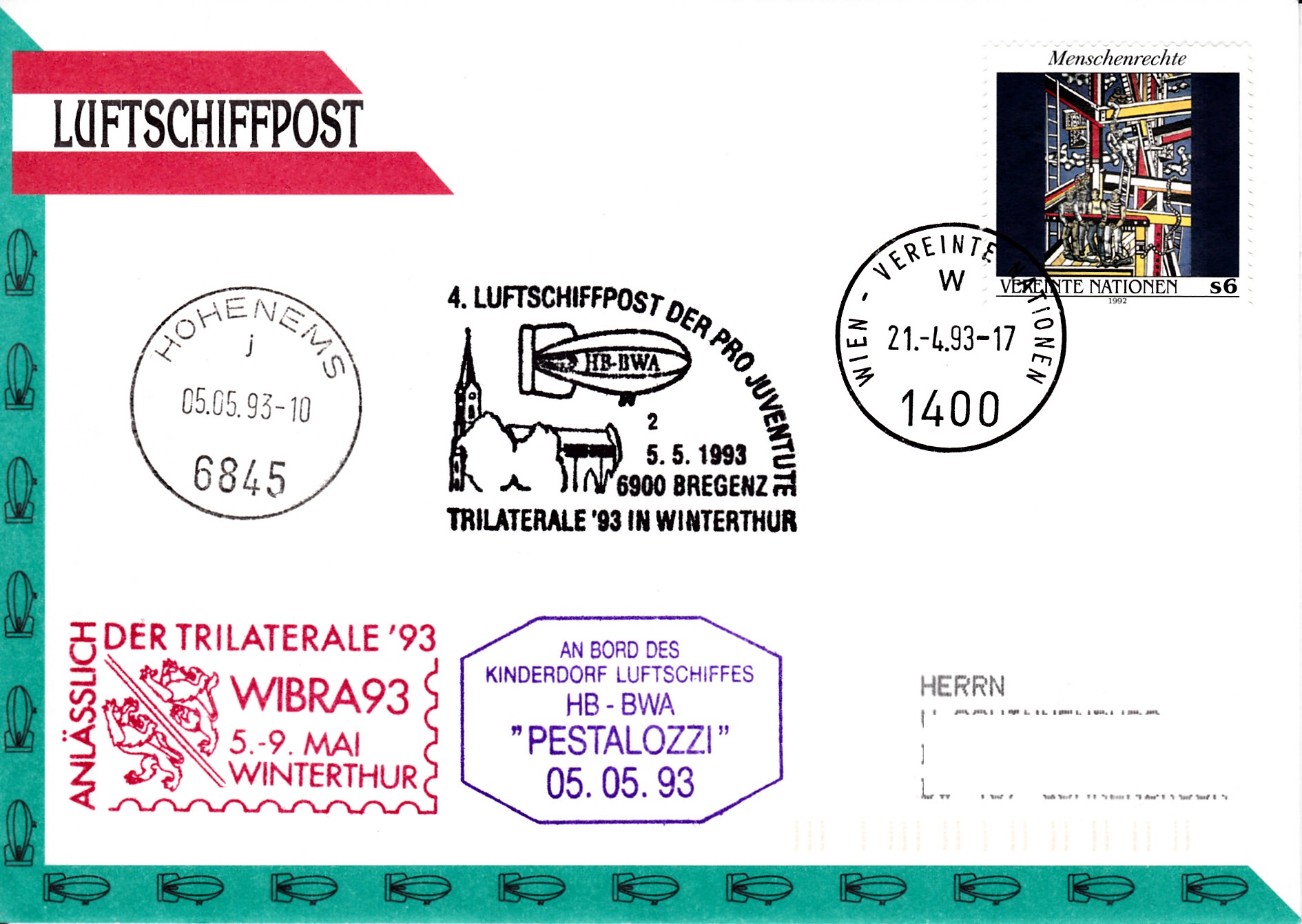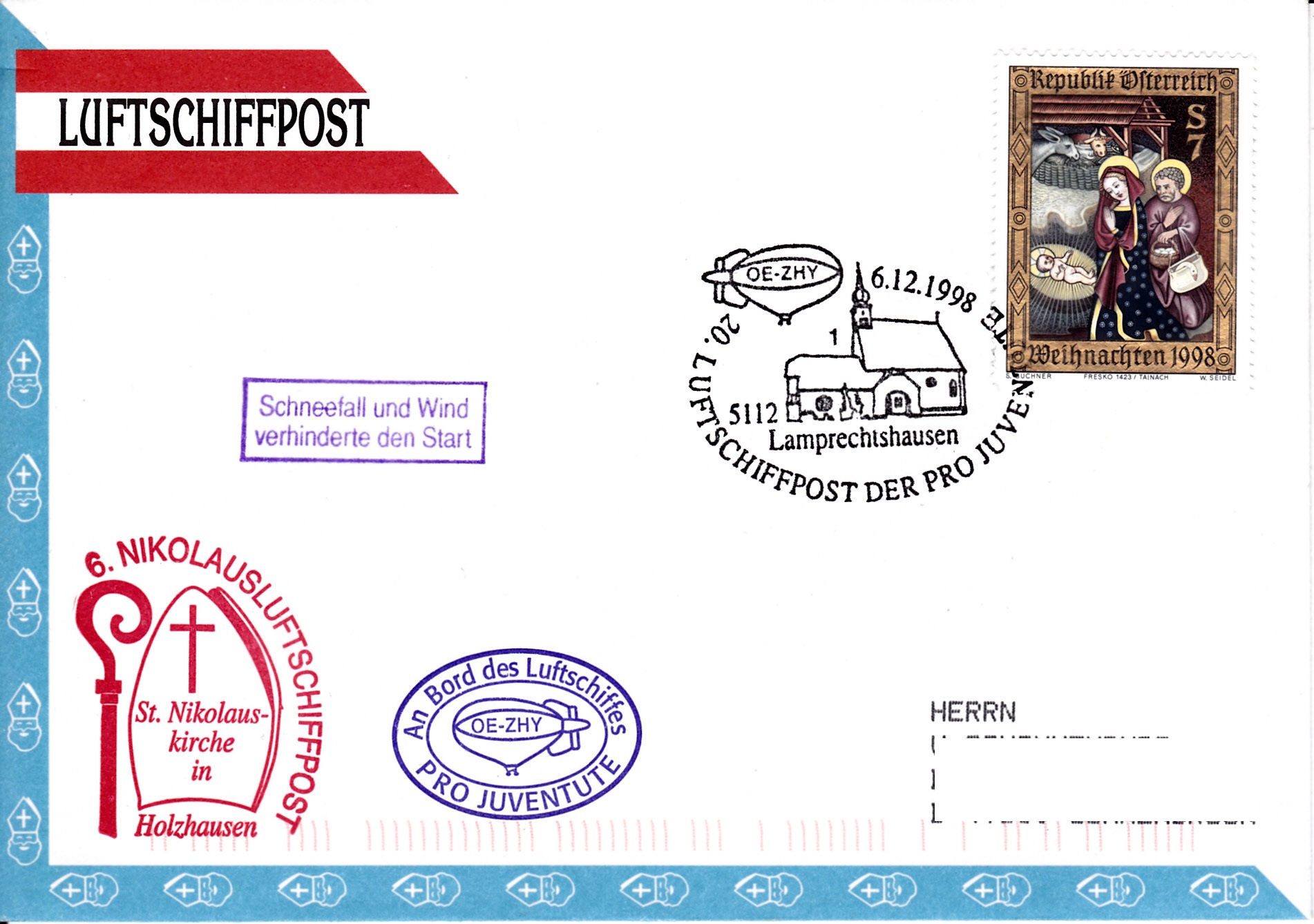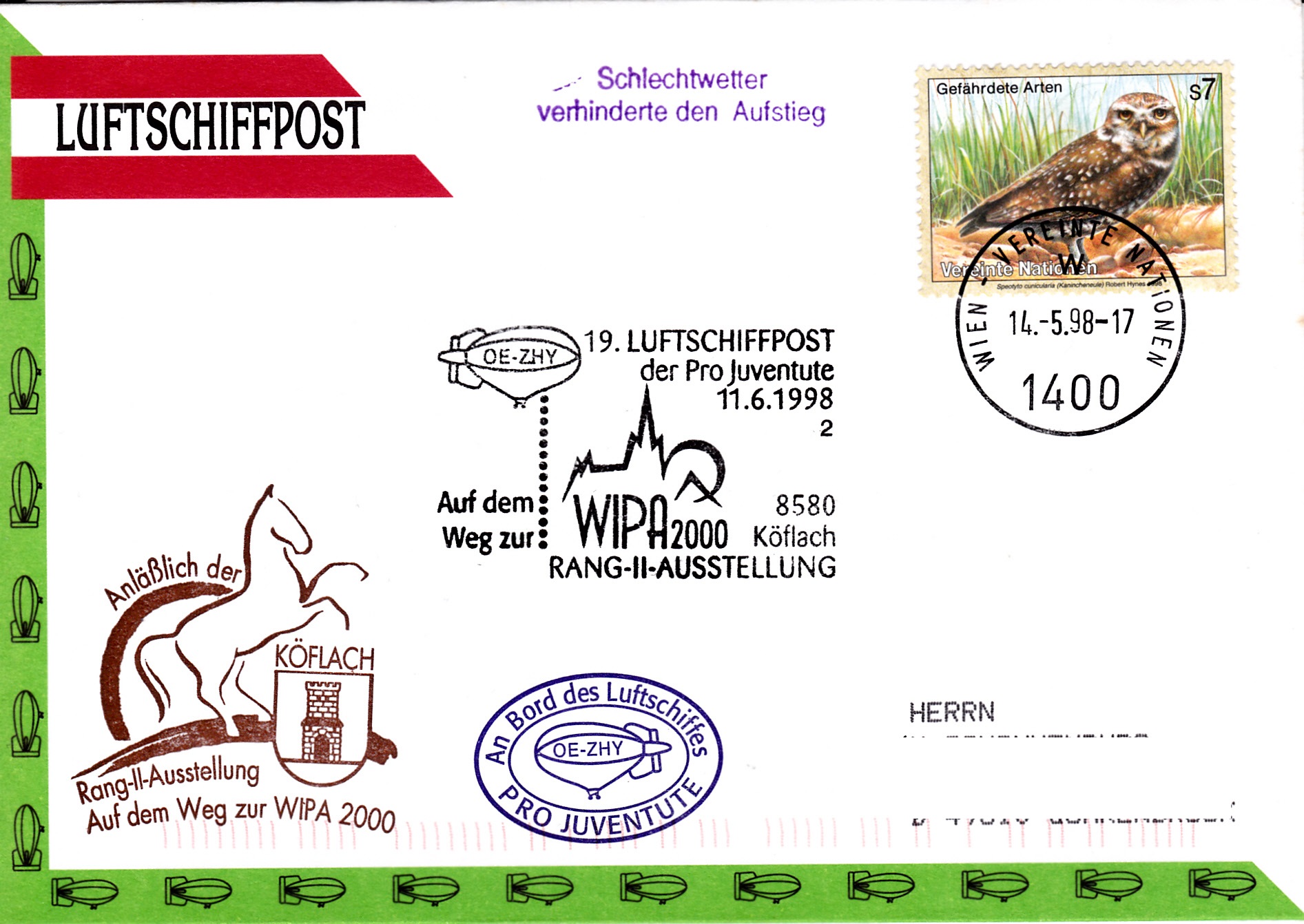 Dieser Brief wurde am 14.5.1998 beim Postamt der UN-Postverwaltung Wien für die 19. Luftschiffpost der Pro Juventute mit dem Luftschiff OE-ZHY aufgegeben. Die Marke wurde mit einem Tagesstempel der UN-Postverwaltung gestempelt. Am 11.6.1998 erhielt der Brief den Sonderstempel aus Köflach mit der Kennziffer "2" zur 19. Luftschiffpost. Da der Aufstieg dem schlechten Wetter zum Opfer fiel, erhielt der Brief noch einen "Ausfallstempel" und einen Bordstempel.