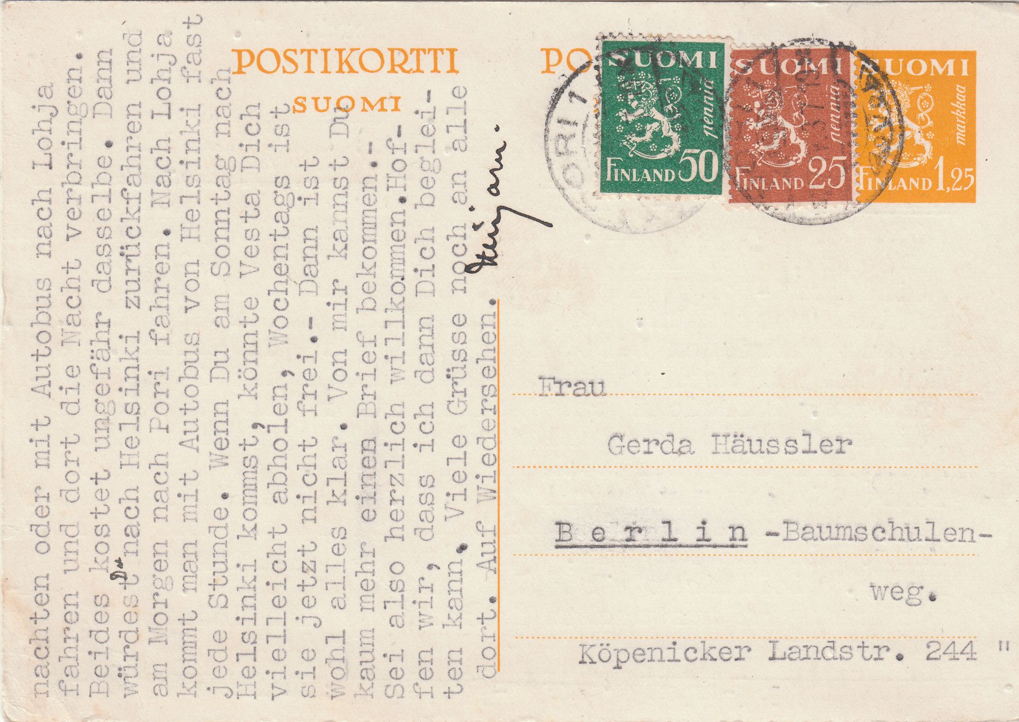 Diese finnische Postkarte wurde am 27.04.1937 gleich mit zwei "passenden" Werten als Zusatzfrankatur versehen: