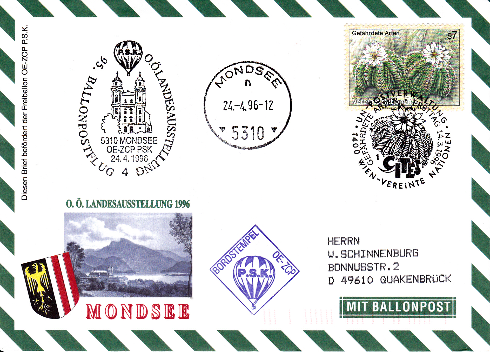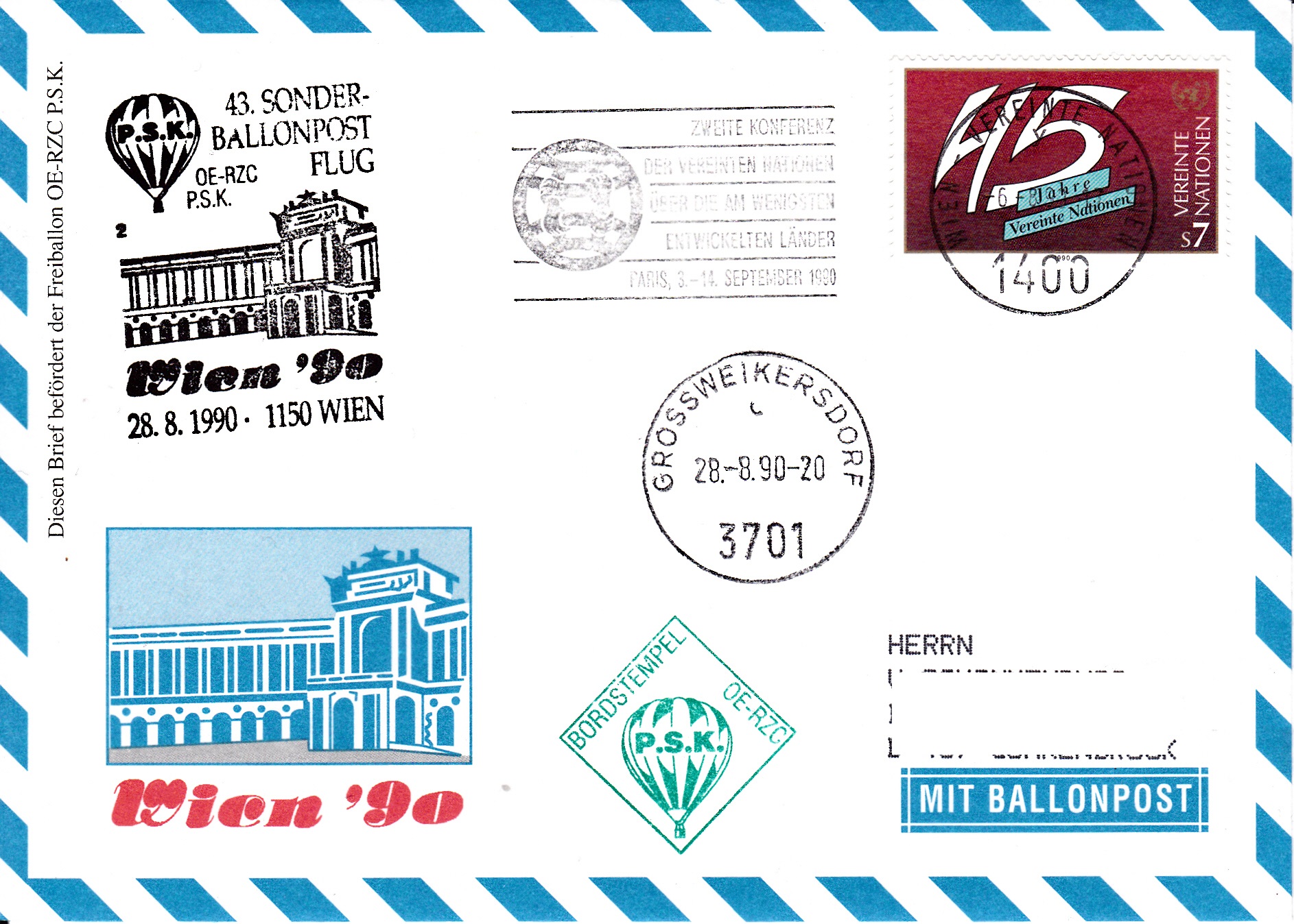 Dieser Brief wurde am Ersttag (26.6.1985) der Marke "40 Jahre Vereinte Nationen (UNO)" der UN-Postverwaltung Wien (MiNr 51 A) bei der Briefmarkenausstellung UNAUSPHILA'85 für den 32. Sonder-Ballonpostflug der Österreichischen Pro Juventute mit einem Ersttagsonderstempel zur Ausstellung mit der Kennziffer "1" gestempelt und am 20.7.1985 mit dem Freiballon OE-KZM befördert. Bei der Ausstellung wurde auch der Cachet-Stempel der UN-Postverwaltung Wien zur UNAUSPHILA'85 zusätzlich angebracht. Der Brief erhielt am 20.7.1985 einen Tagesstempel Wien Kennbuchstabe "f", den Sonderstempel zum 32. Sonder-Ballonpostflug mit der Kennziffer "3" und einen Bordstempel.