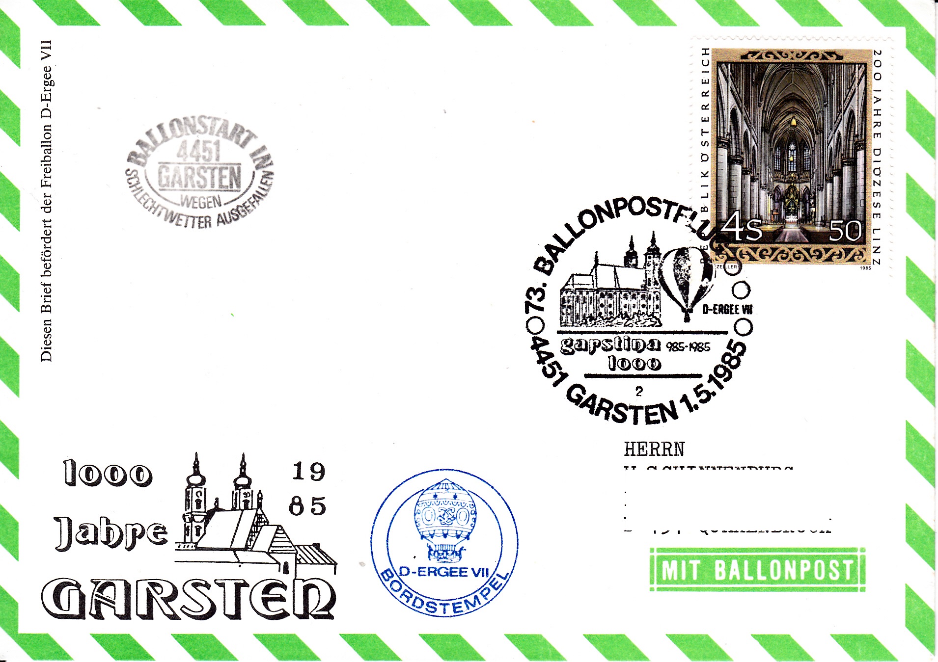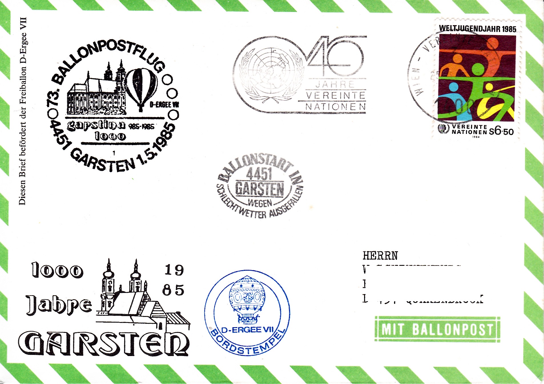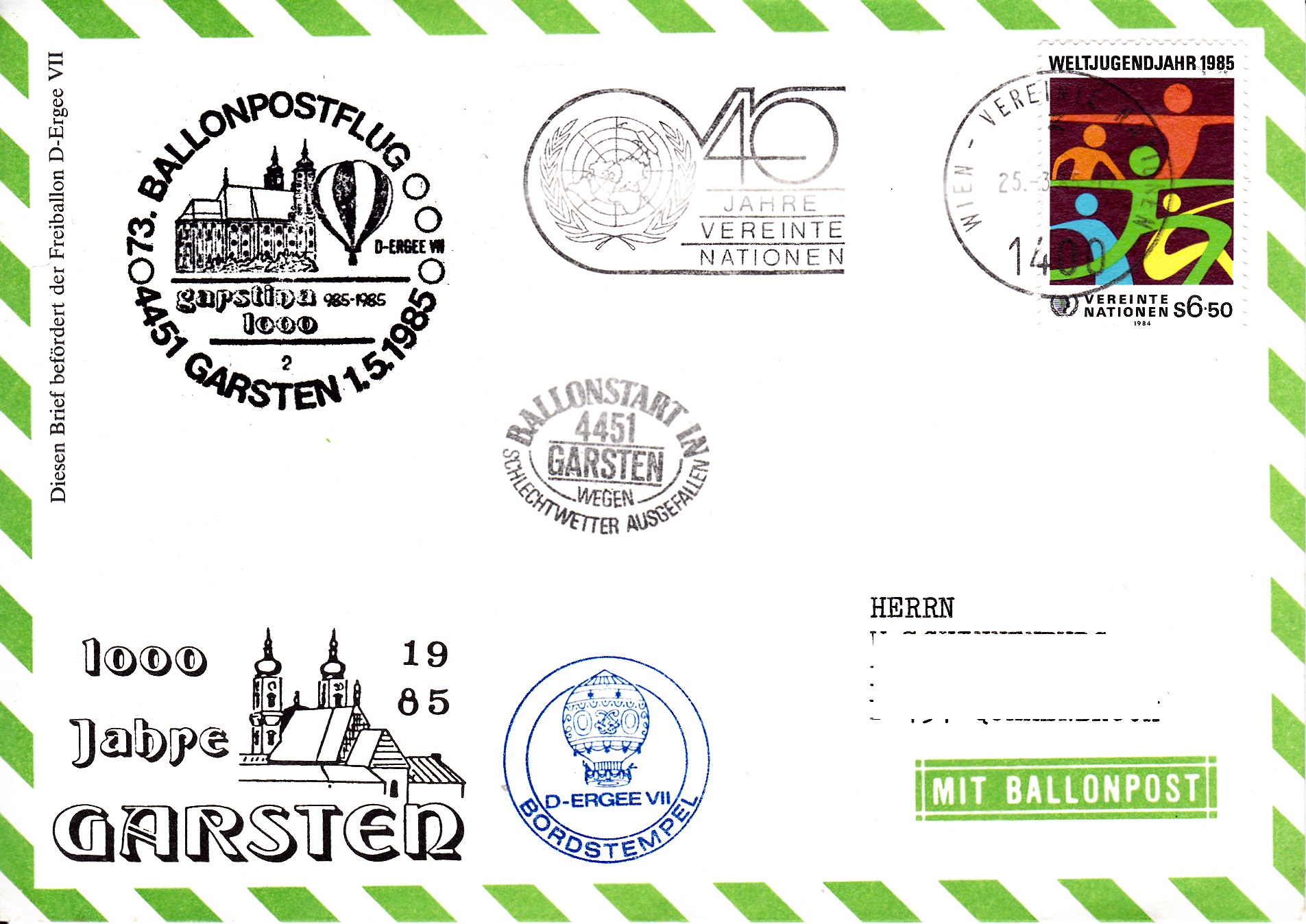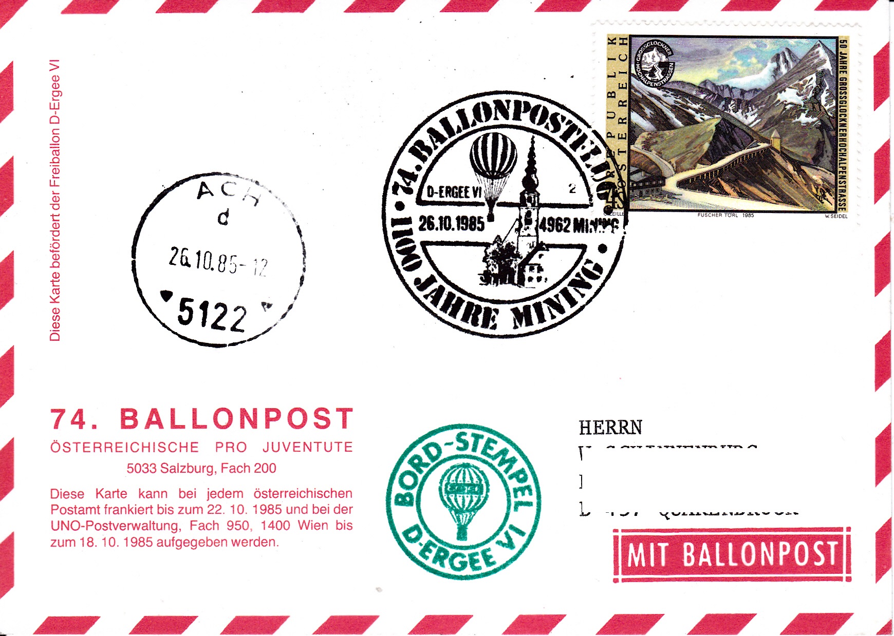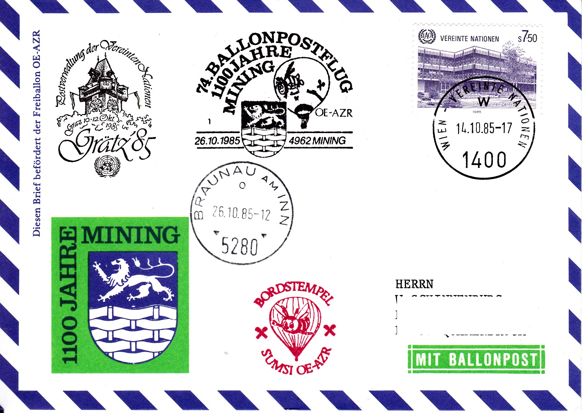 Dieser Brief wurde am 14.10.1985 bei der UN-Postverwaltung Wien für den 74. Ballonpostflug der Österreichischen Pro Juventute mit dem Ballon SUMSI OE-AZR aufgegeben und mit dem Tagesstempel mit dem Kennbuchstaben "w" gestempelt. Am 326.10.1985 wurde er mit dem Ballon OE-ZMR Xerox befördert. Er erhielt an diesem Tag den Sonderstempel aus Mining mit der Kennziffer "1" zu diesem 74. Ballonpostflug, einen Tagesstempel aus Braunau am Inn mit dem Kennbuchstaben "m" und einen Bordstempel.