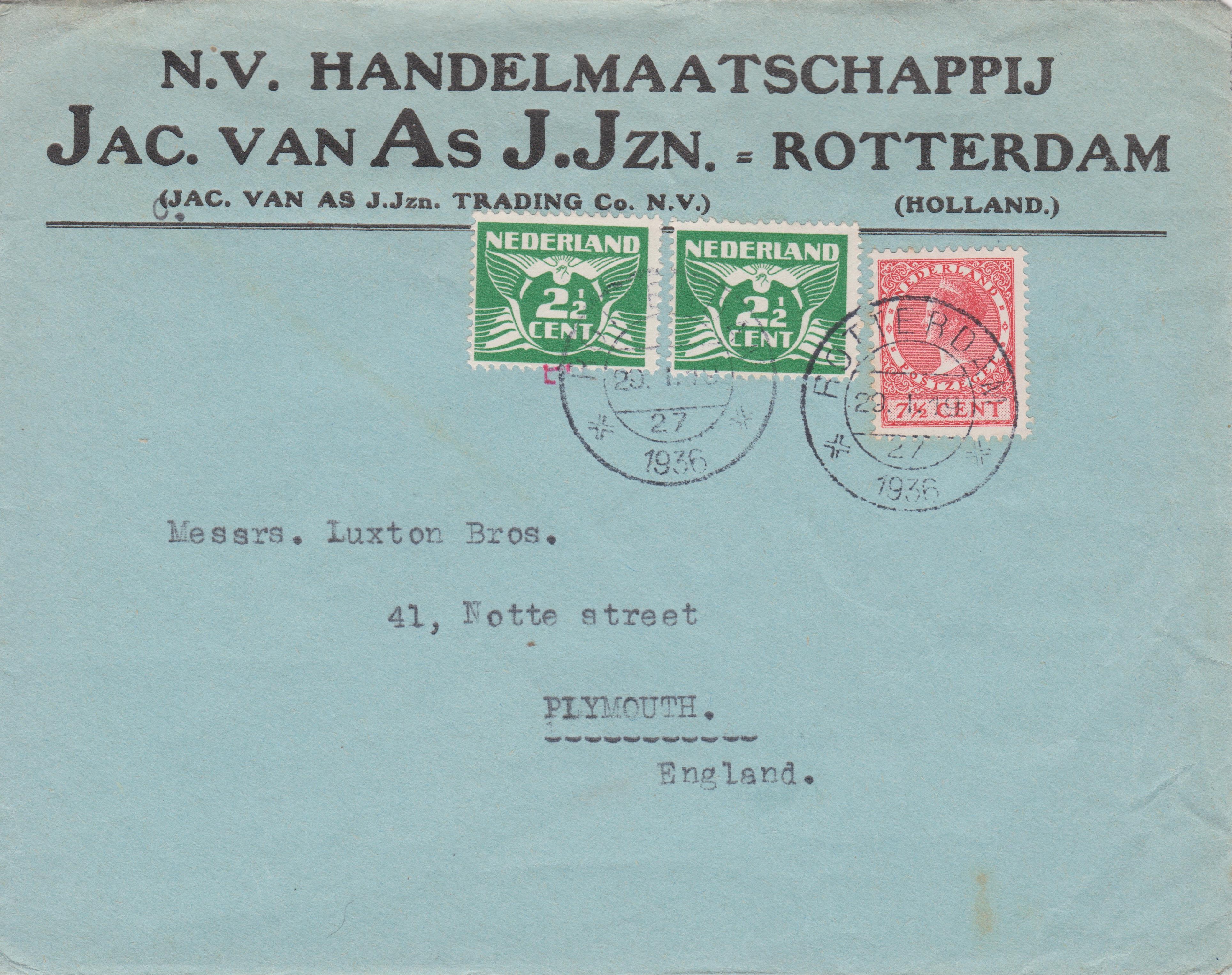 Brief, adressiert nach PLYMOUTH, aufgegeben am 29.01.1936 in ROTTERDAM: