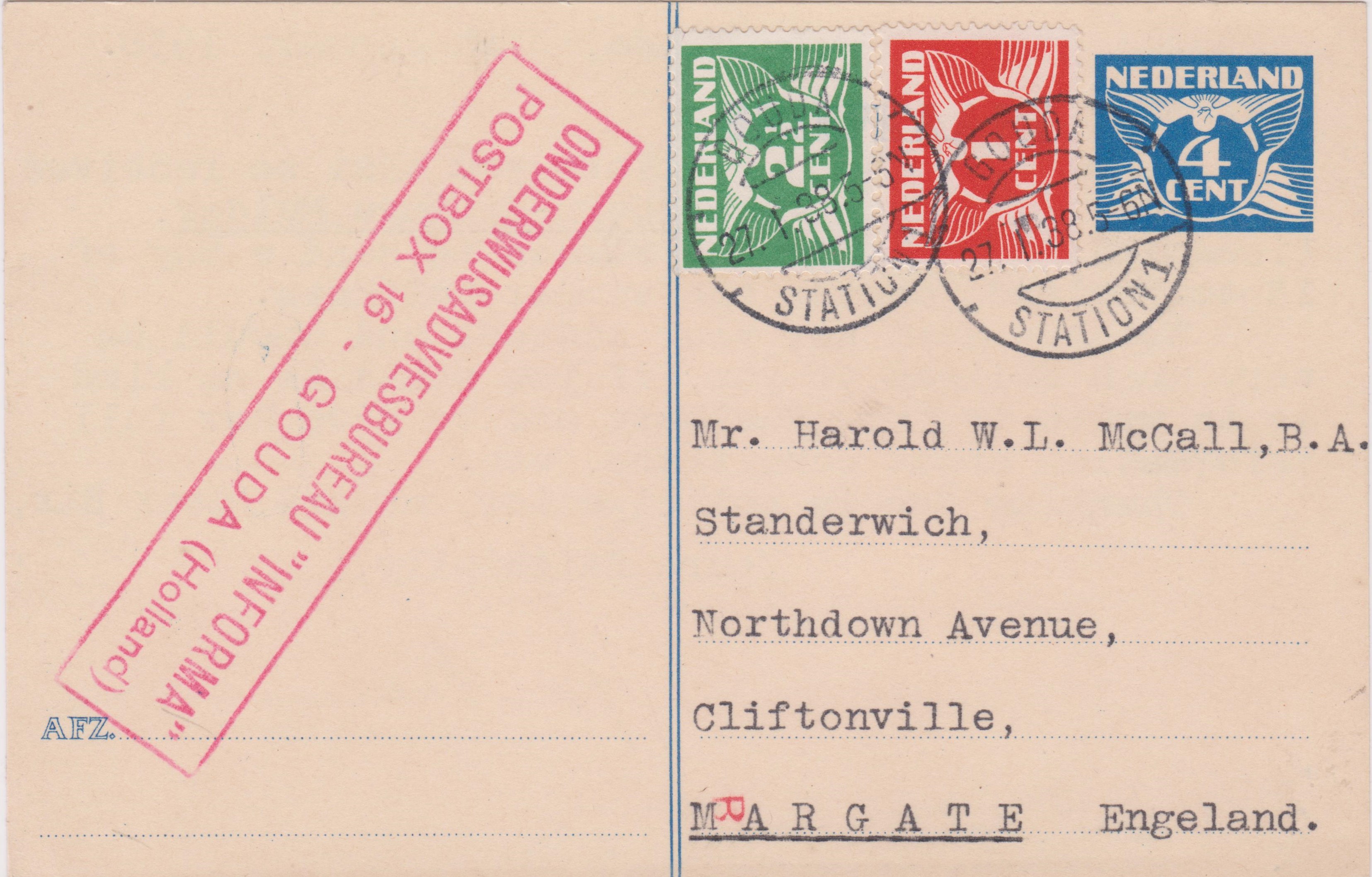 Ganzsache NEDERLAND 4 CENT mit Zusatzfrankatur 3 1/2 CENT aufgegeben am 27.01.1938 in GOUDA 1 STATION, adressiert nach "MARGATE England":