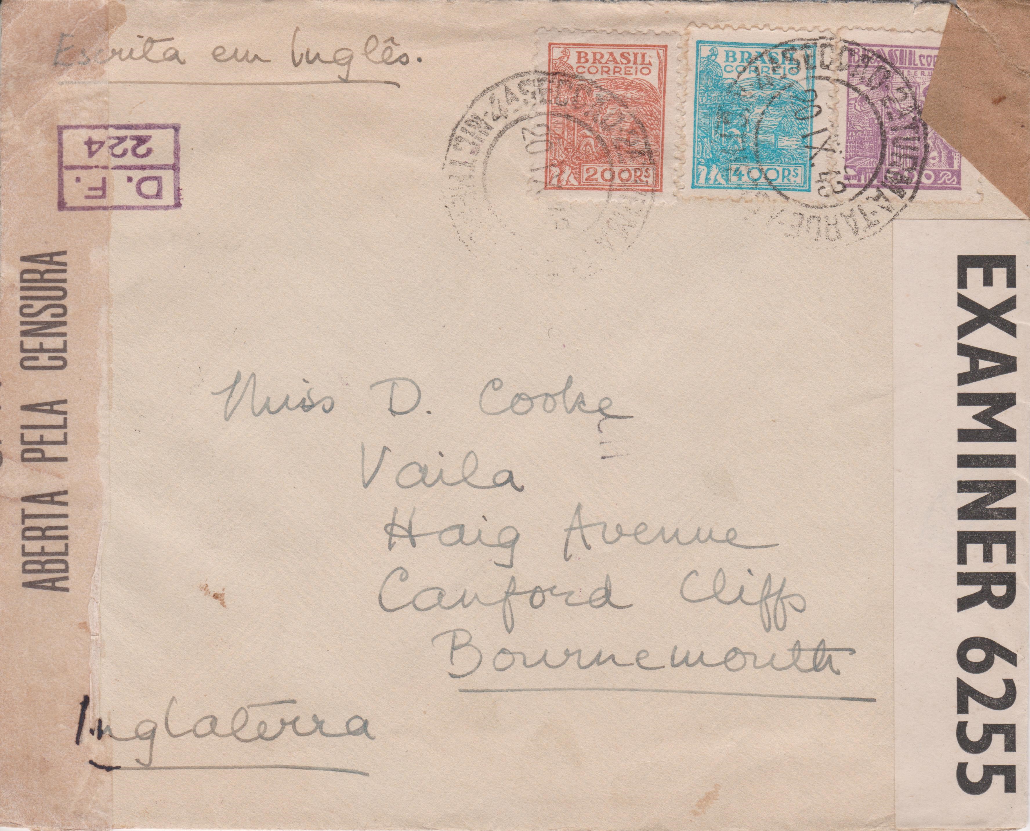 Brief aus Brasilien nach "Inglaterra" = England mit Doppelzensur sowie Transorma-Stempel "CH":