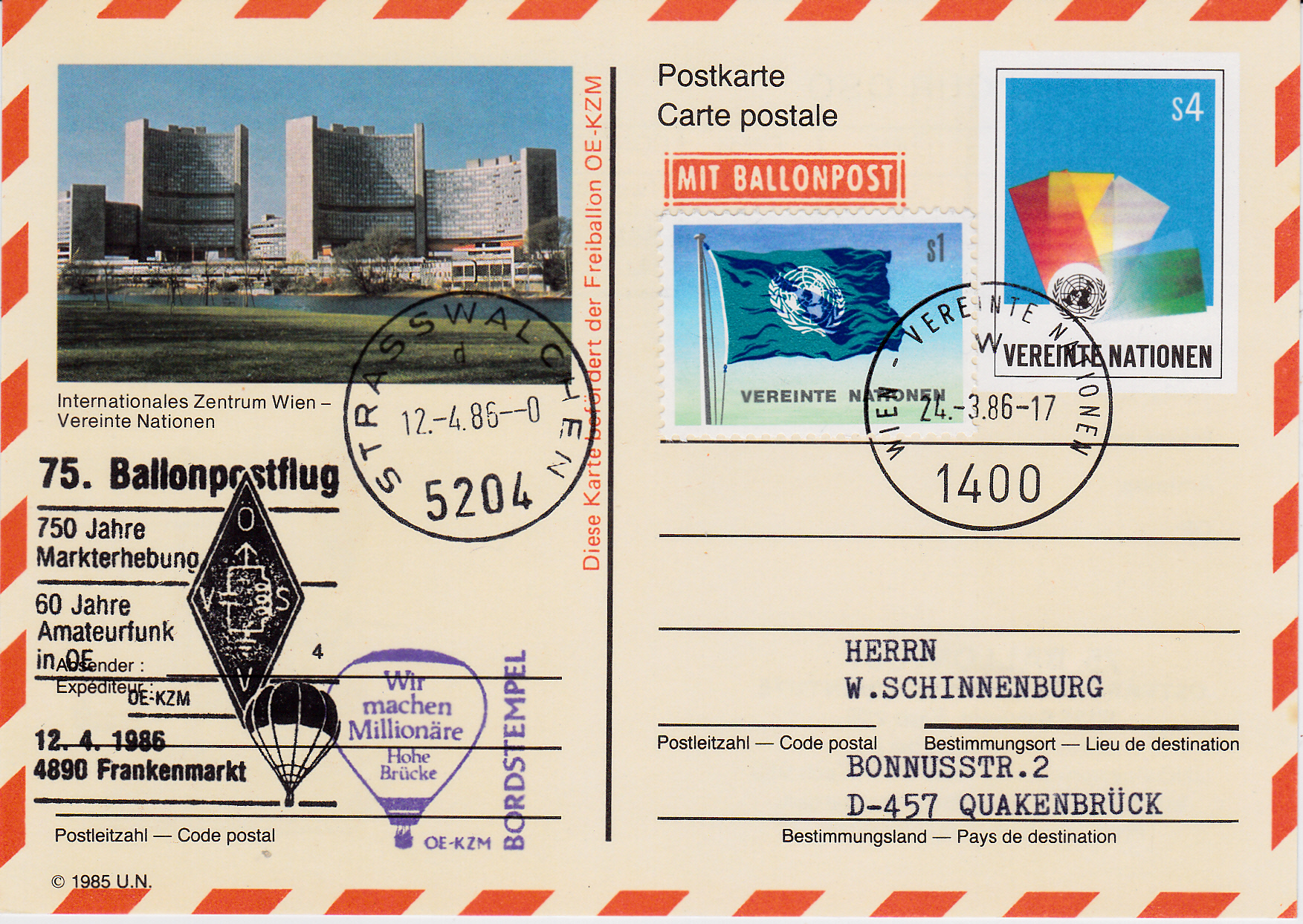Diese Bildpostkarte (Ganzsache mit Zudruck) mit Zusatzfrankatur wurde am 24.3.1986 für den 75. Ballonpostflug der Österreichischen Pro Juventute mit dem Freiballon OE-KZM in Wien beim UNO-Postamt aufgegeben. Sie erhielt einen Tagesstempel Wien - Vereinte Nationen. Am 12.4.1986 wurde der Sonderstempel mit der Kennziffer "4" aus Frankenmarkt zu diesem Ballonflug auf der Karte abgeschlagen. Sie erhielt zusätzlich einen Tagesstempel Strasswalchen mit dem Kennbuchstaben "d" und einen Bordstempel.