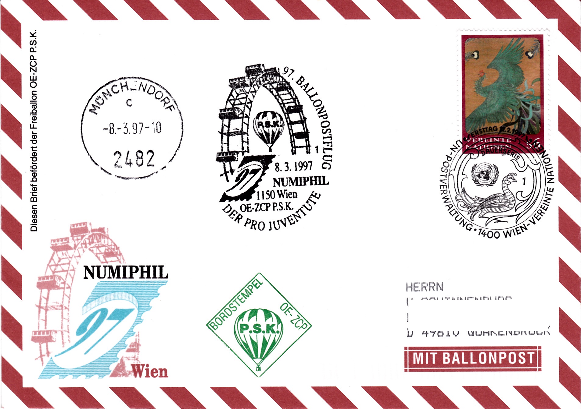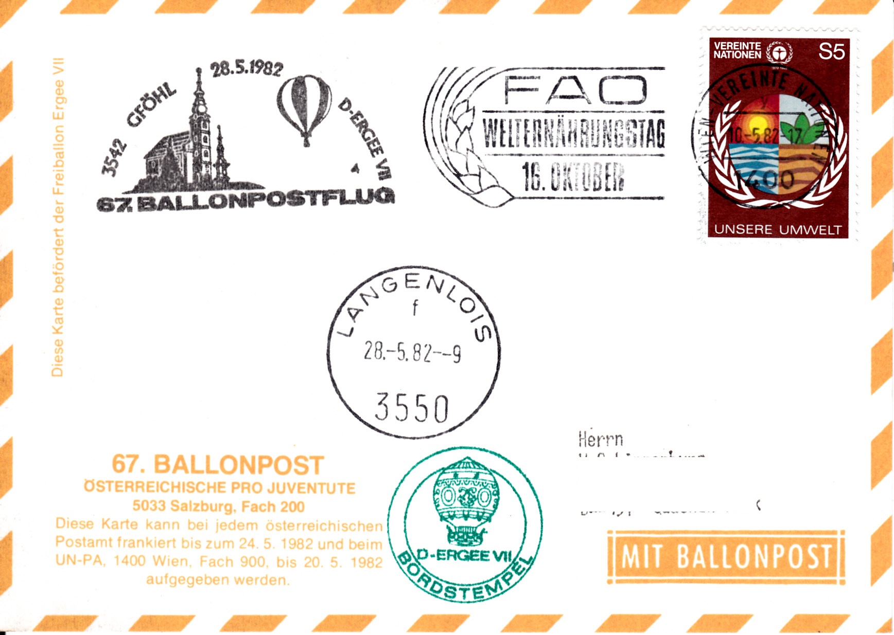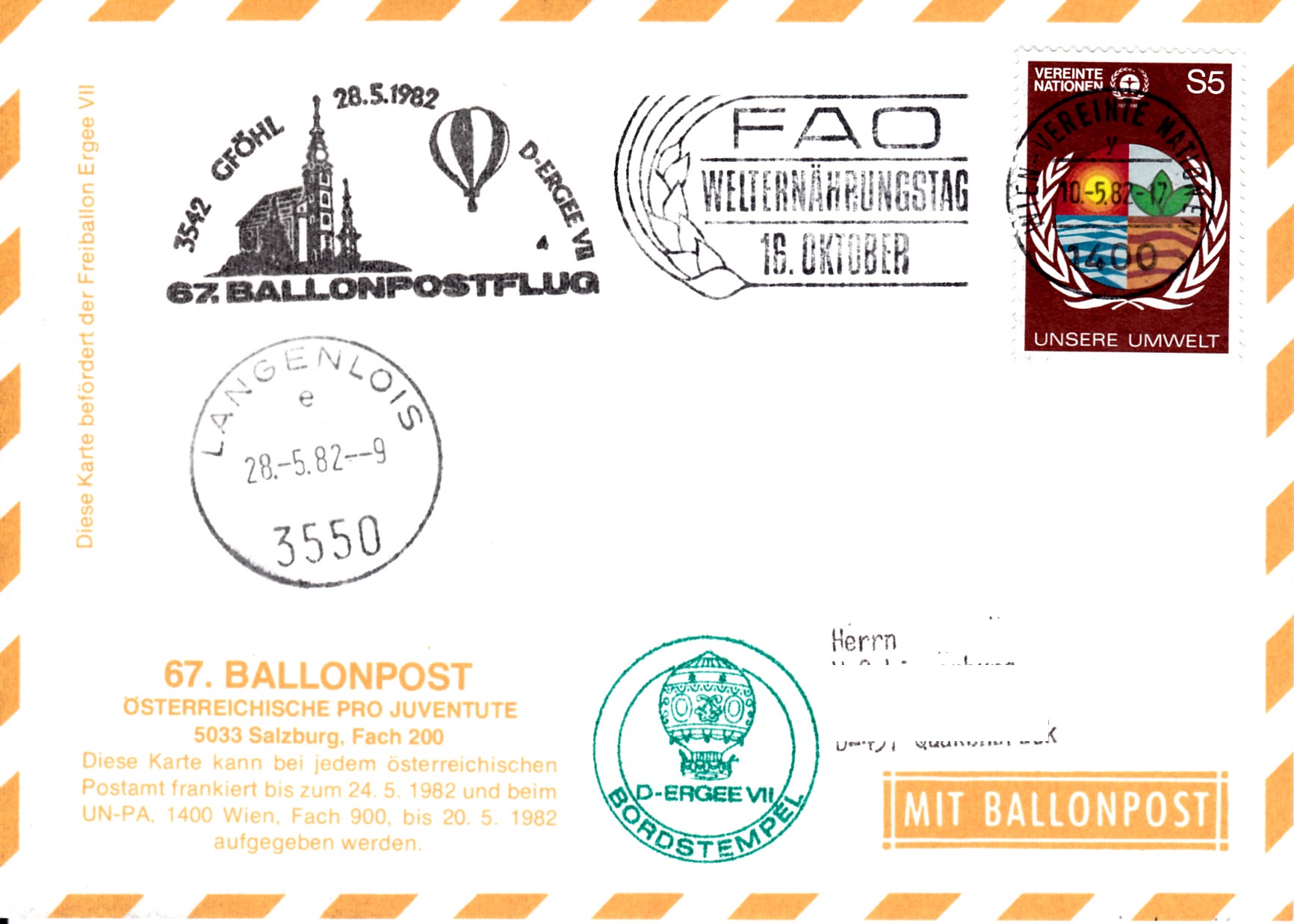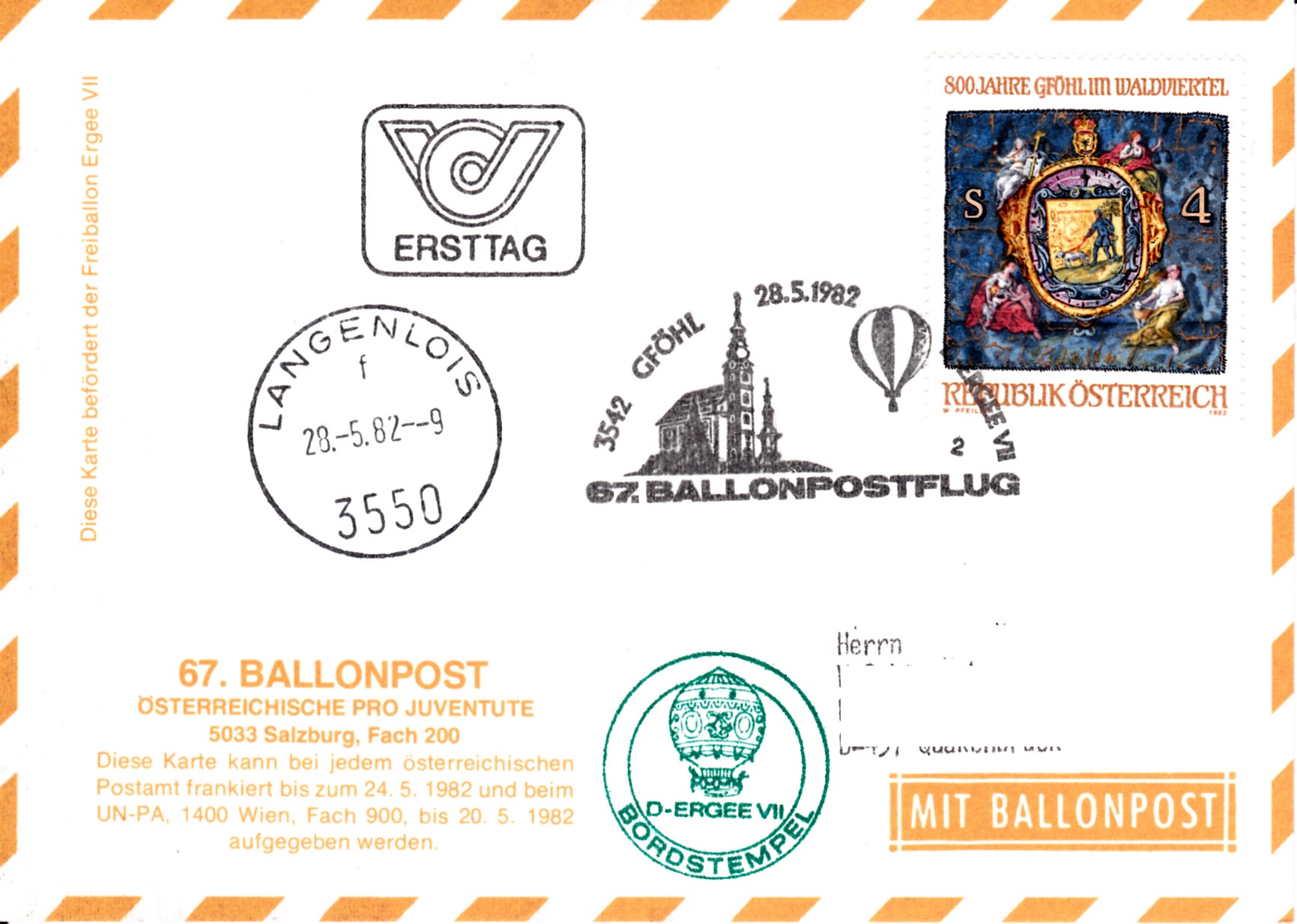 Diese Postkarte wurde am 28.5.1982 in Gföhl für den 67. Ballonpostflug der Österreichischen Pro Juventute mit dem Freiballon D-ERGEE VII aufgegeben. Er erhielt den Sonderstempel mit der Kennziffer "2" aus Gföhl zu diesem Ballonflug und wurde am gleichen Tag mit dem Freiballon D-ERGEE VII befördert. Er erhielt zusätzlich einen Stempel "Ersttag", einen Tagesstempel Langenlois mit dem Kennbuchstaben "e" und einen Bordstempel.