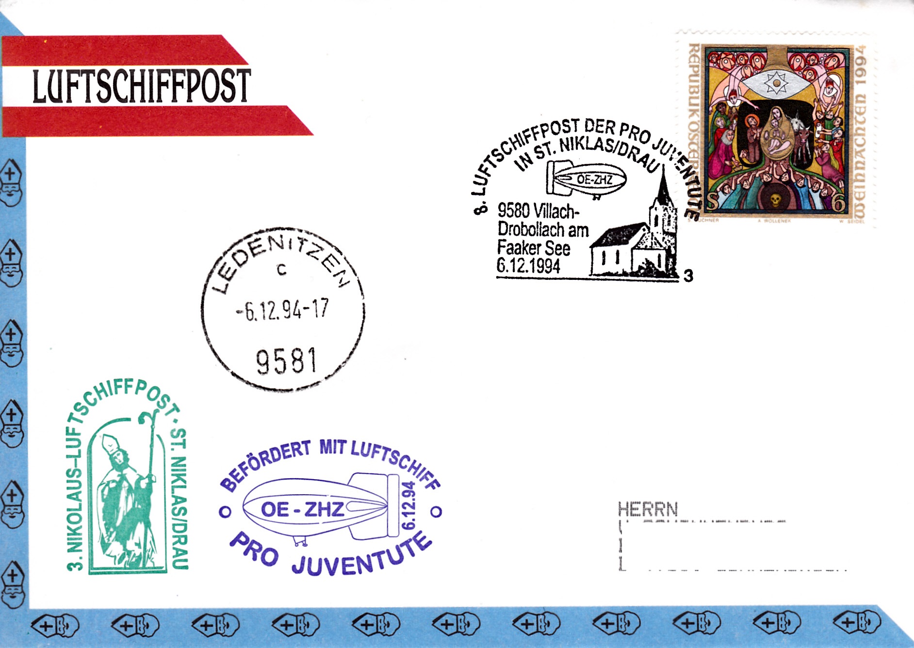 Dieser Brief wurde am 6.12.1994 in Villach-Drobollach am Faaker See für die 8. Luftschiffpost der Pro Juventute und 3. Nikolaus-Luftschiffpost mit dem Luftschiff OE-ZHZ aufgegeben. Die Marke wurde mit dem passenden Sonderstempel aus Villach-Drobollach am Faaker See mit der Kennziffer "3" gestempelt. Es wurde auch noch ein Tagesstempel aus Ledenitzen und der Bordstempel auf dem Brief angebracht.
