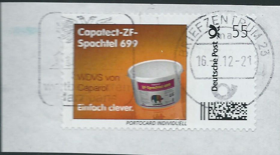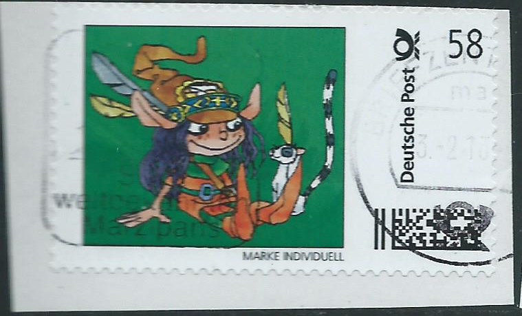 Hier habe ich eine 58 ct Marke, die ich nicht zuordnen kann. Die abgebildete Figur sagt mir nichts, vielleicht kann mich da mal jemand aufklären, wer oder was das sein soll. Gestempelt im Briefzentrum 23 (23 erkennbar am Werbeeinsatz) am 3.2.13