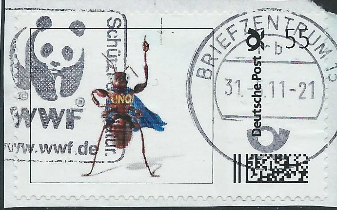 Und was soll uns diese Marke sagen? Die Ameise trägt zwar den Schriftzug UNO, aber was soll das bedeuten? 55 ct Marke abgestempelt im Briefzentrum 13 am 31.5.11