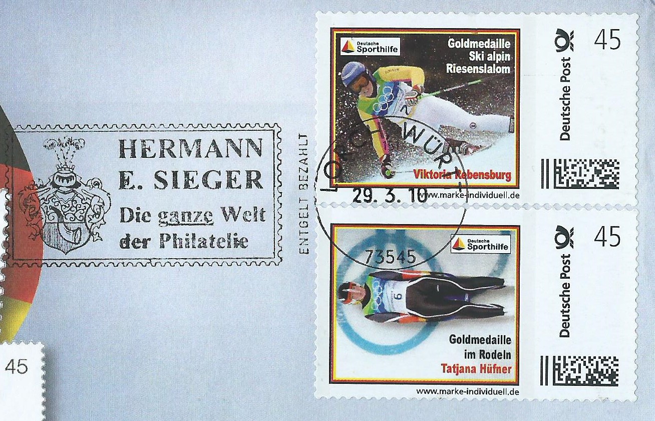 Und weil es so schön war, noch 2: Diese mit Wintersportmotiven der Deutschen Sporthilfe. Hiervon hatte die Firma Hermann E. Sieger mal ein ganzes Set verschiedener Motive aufgelegt und vertrieben. Dieser Ausschnitt ist vom Absender gestempelt in Lorch am 29.3.10