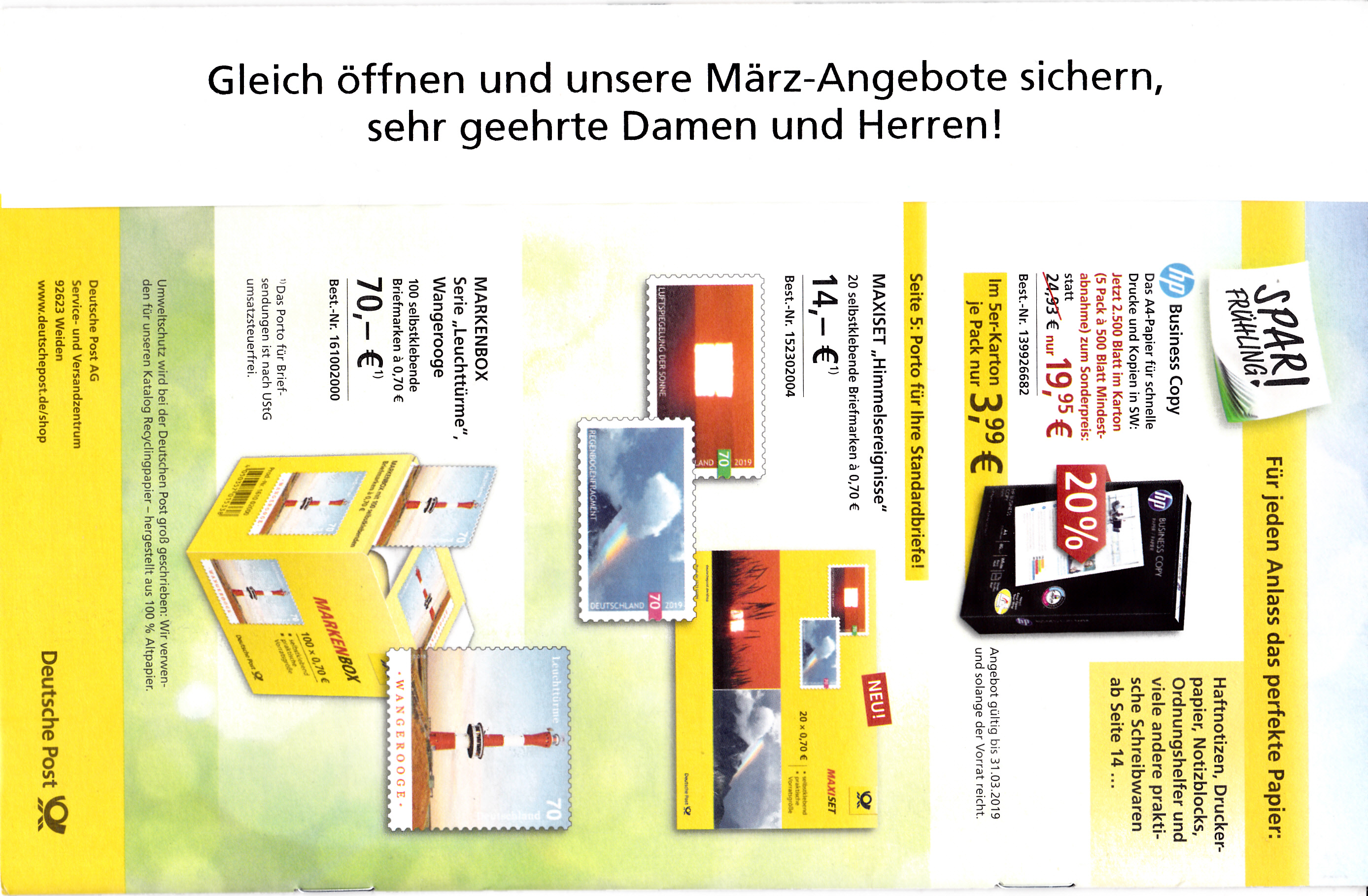 Diese Broschüre im Format 235 x 152 mm (unten geheftet) hat einen Wertstempel mit der 145 Cent Marke "Der einsame Baum" nach dem Gemälde von Caspar David Friedrich (MiNr 3433) aus der Serie "Schätze aus deutschen Museen". Die Vorausentwertung hat das Datum "21.-2.19".