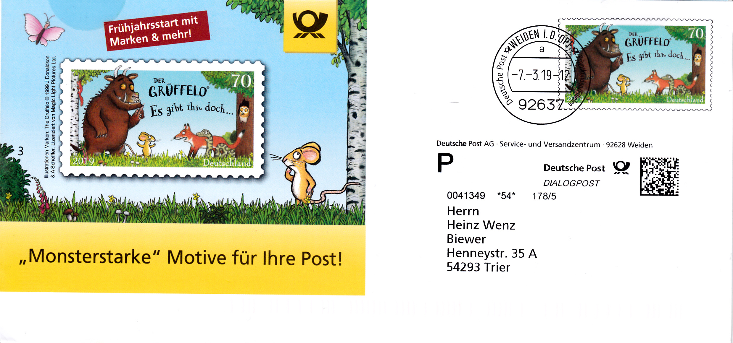 Faltbrief 210 mm x 102 mm mit Wertstempel der 70C-Marke "Der Grüffelo" (MiNr 3450) mit aufgedruckter Zähnung und Vorausentwertung "Deutsche Post (Posthorn) WEIDEN I.D.OPF (Posthorn) Privatkunden/Filialen / a / -7.-3.19-12".