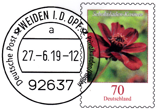 Faltbrief im Format 210 mm x 102 mm mit Wertstempel der 70C-Marke aus der Dauerserie "Blumen" mit dem Motiv "Schokoladen-Kosmee" (MiNr 3189) mit aufgedruckter Zähnung und Vorausentwertung "Deutsche Post (Posthorn) WEIDEN I.D.OPF (Posthorn) Privatkunden/Filialen / a / 27.-6.19-12".