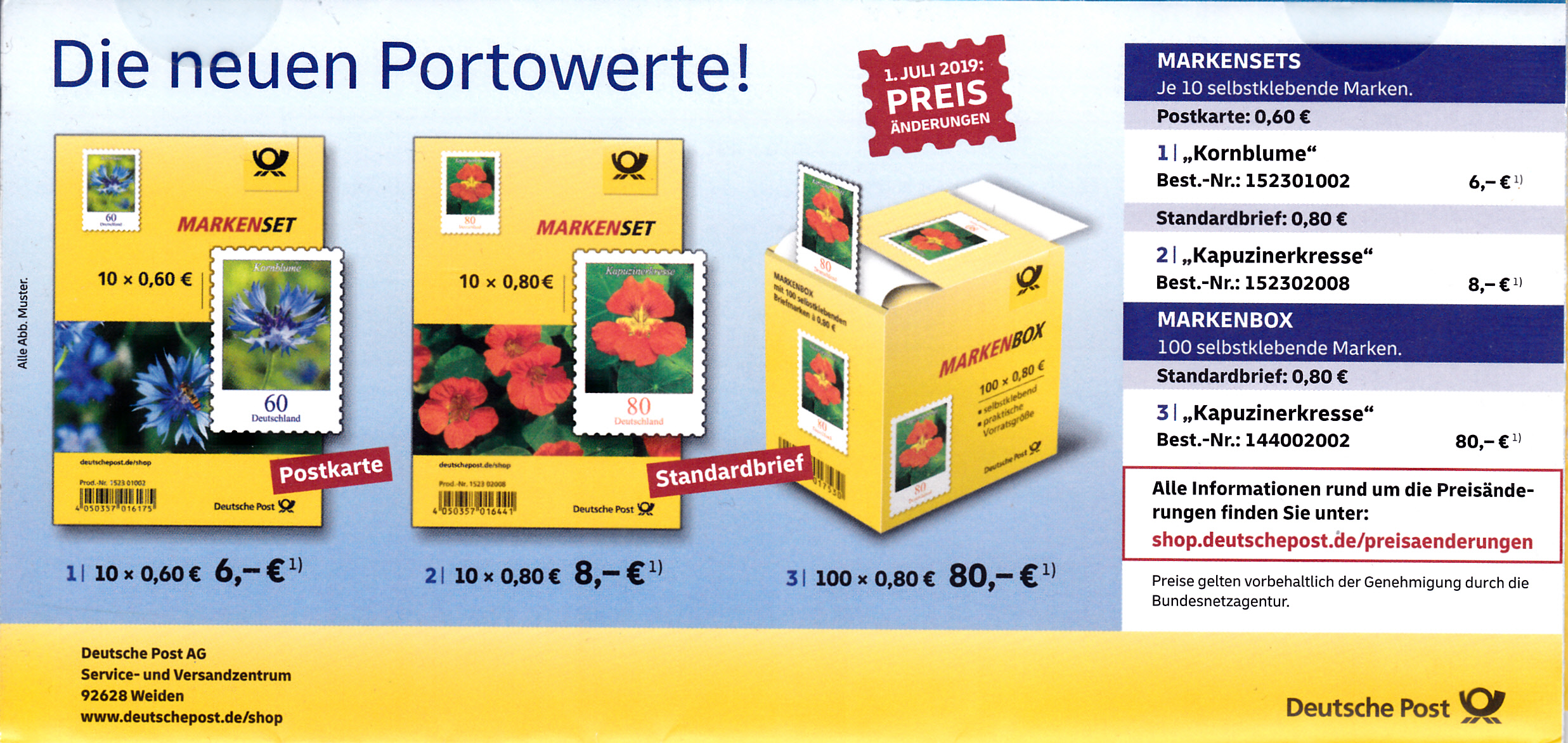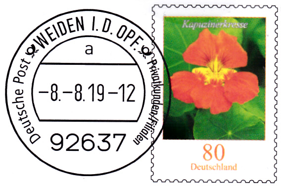 Faltbrief im Format 210 mm x 102 mm mit Wertstempel der 80C-Marke aus der Dauerserie "Blumen" mit dem Motiv "Große Kapuzinerkresse" (MiNr 3469) mit aufgedruckter Zähnung und Vorausentwertung "Deutsche Post (Posthorn) WEIDEN I.D.OPF (Posthorn) Privatkunden/Filialen / a / -8.-8.19-12".