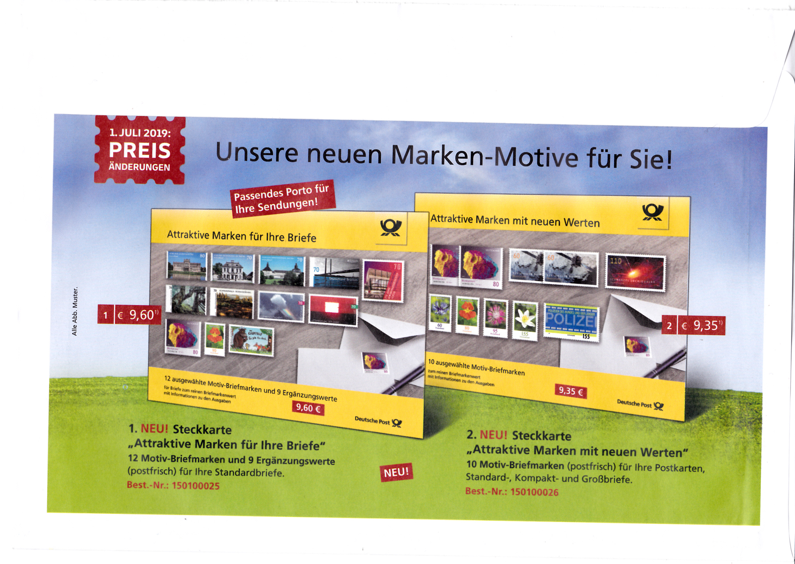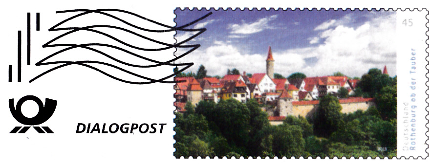 Diese Broschüre im Format 235 x 152 mm (unten geheftet) hat einen Wertstempel mit einer 45 Cent Marke "Altstadt von Rothenburg ob der Tauber" aus der Serie "Deutschlands schönste Panoramen" (MiNr 3455). Die Marke ist mit einer Welle "Dialogpost" entwertet.