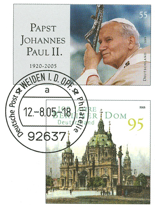 Als Faltkarte konzipiert, wurde den beiden Wertstempeln das Vorausentwertungsdatum "12.-8.05 - 18" aufgedruckt.