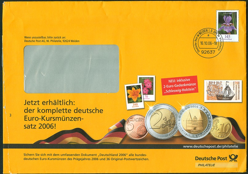 Der Wertstempel (145 Cent) mit dem Motiv der Schwertlilie und dem aufgedruckten V-Datum "00.00.06 - 18" tritt wegen der aptierten Weidener Stempelvorlage ein wenig in den Interessenhintergrund.