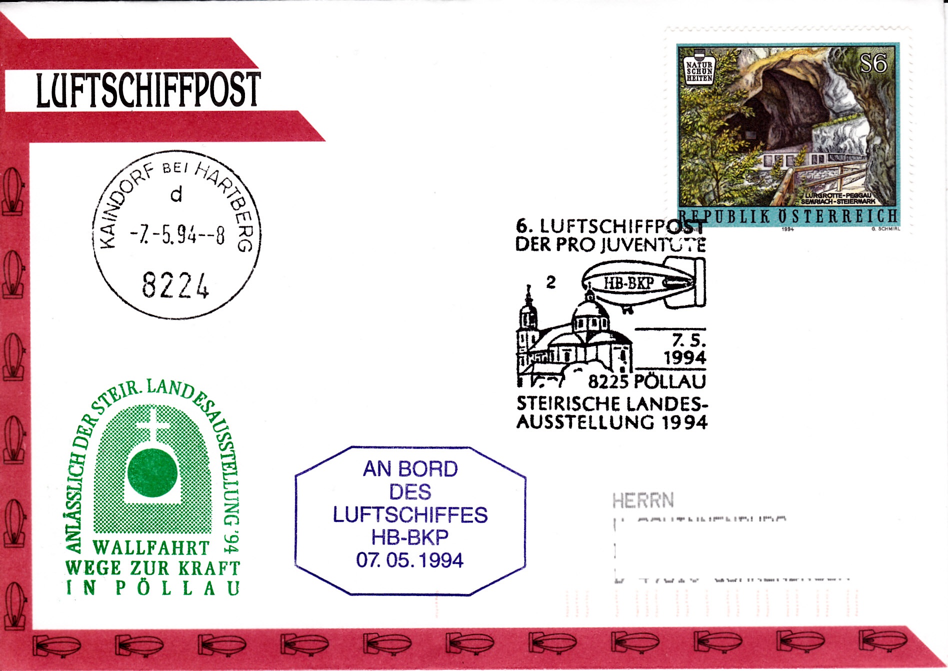 Dieser Brief wurde am 7.5.1994 in Pöllau für die 6. Luftschiffpost der Pro Juventute mit dem Luftschiff HB-BKP aufgegeben. Die Marke wurde mit dem passenden Sonderstempel aus Pöllau mit der Kennziffer "2" gestempelt und mit dem Zeppelin HB-BKP befördert. Es wurde auch noch ein Tagesstempel aus Kaindorf bei Hartberg und der Bordstempel auf dem Brief angebracht.