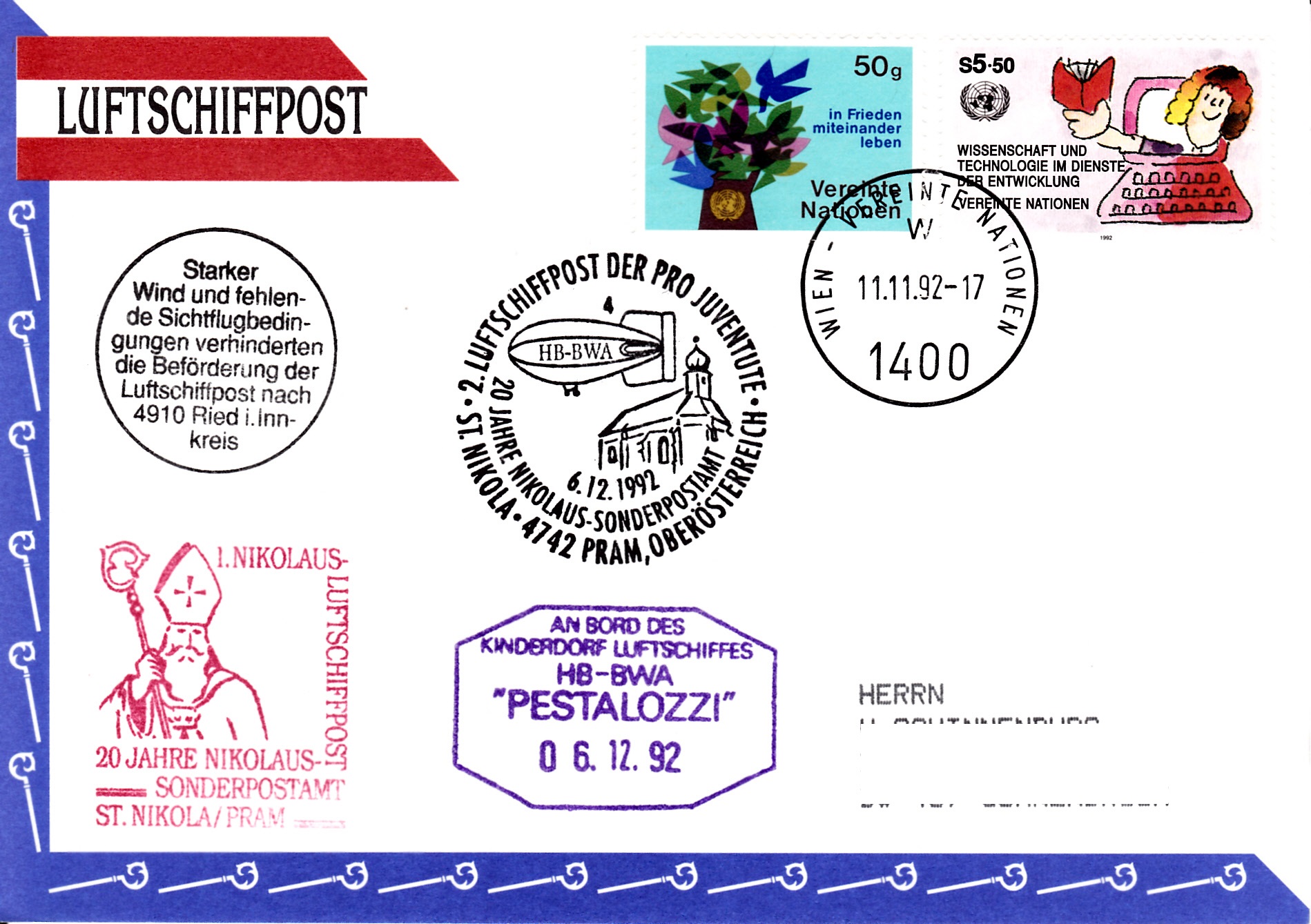 Diese Karte wurde am 11.11.1992 beim Postamt der UN-Postverwaltung Wien für die 2. Luftschiffpost der Pro Juventute mit dem Luftschiff HB-BWA aufgegeben. Die Marke wurde mit einem Tagesstempel der UN-Postverwaltung gestempelt. Am 6.12.1992 erhielt der Brief den Sonderstempel aus Pram, Oberösterreich, mit der Kennziffer "4" zur 2. Luftschiffpost. Da der Start wegen schlechten Sichtflugbedingungen und starkem Wind nicht stattfand, erhielt der Brief noch einen "Ausfallstempel" und einen Bordstempel.