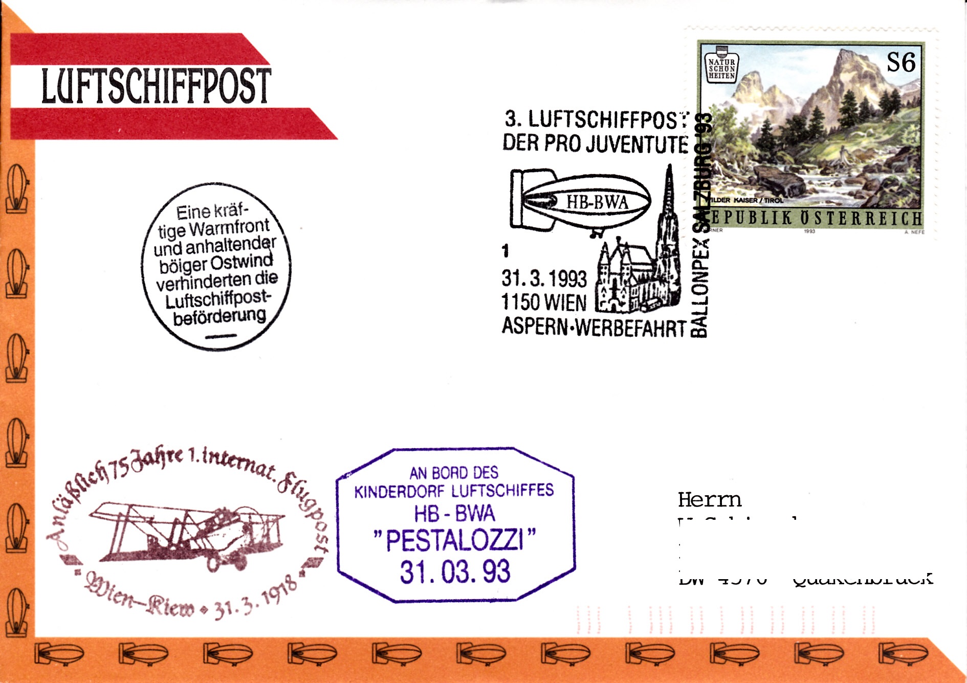 Dieser Brief wurde am 31.3.1993 in Wien für die 3. Luftschiffpost der Pro Juventute mit dem Luftschiff HB-BWA aufgegeben. Die Marke wurde mit dem zur 3. Luftschiffpost passenden Sonderstempel aus Wien mit der Kennziffer "1" gestempelt. Da der Start wegen starkem Wind nicht stattfand, erhielt der Brief noch einen "Ausfallstempel" und einen Bordstempel.