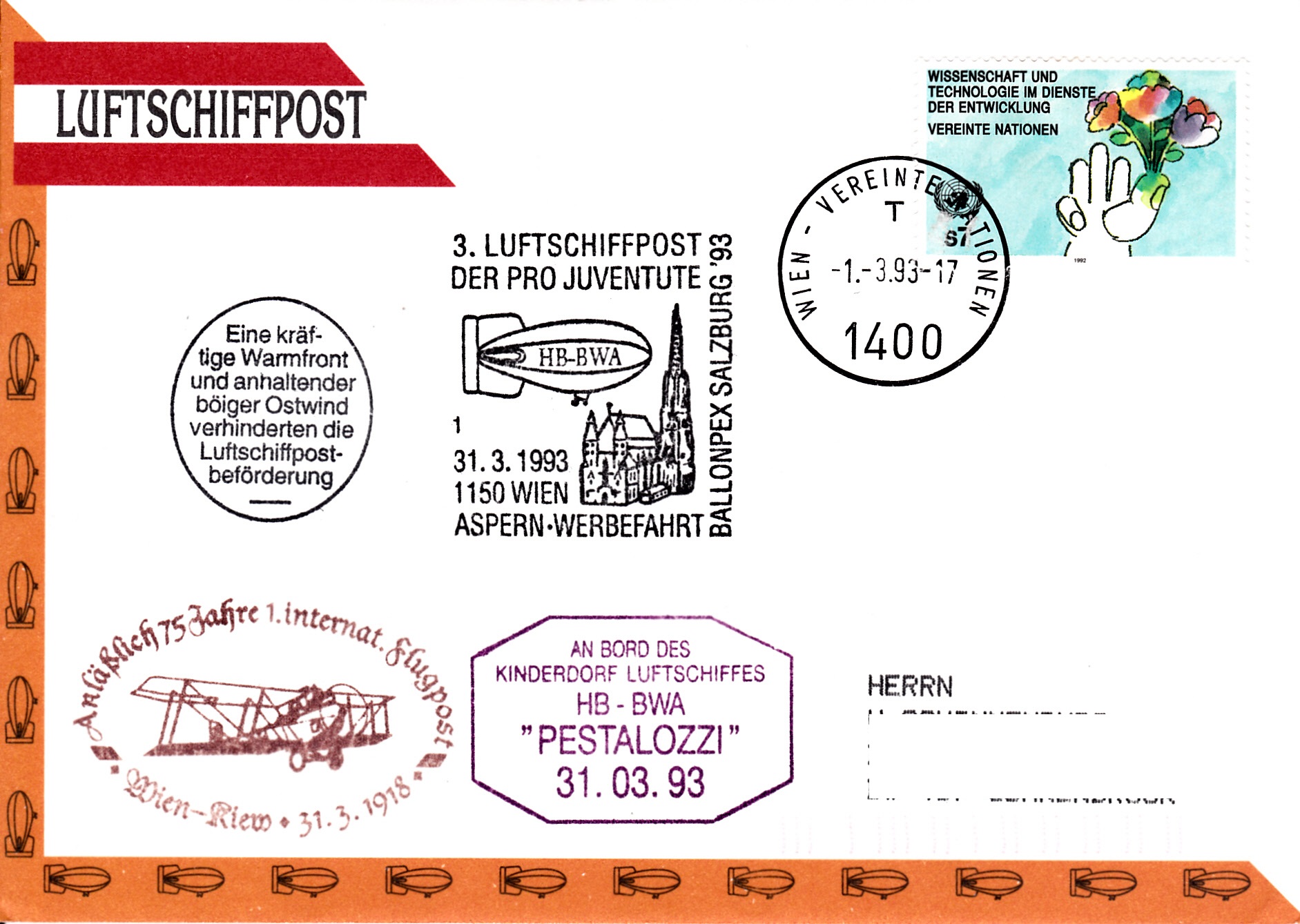 Dieser Brief wurde am 1.3.1993 beim Postamt der UN-Postverwaltung Wien für die 3. Luftschiffpost der Pro Juventute mit dem Luftschiff HB-BWA aufgegeben. Die Marke wurde mit einem Tagesstempel der UN-Postverwaltung gestempelt. Am 31.3.1993 erhielt der Brief den Sonderstempel aus Wien mit der Kennziffer "41 zur 23 Luftschiffpost. Da der Start wegen starkem Wind nicht stattfand, erhielt der Brief noch einen "Ausfallstempel" und einen Bordstempel.