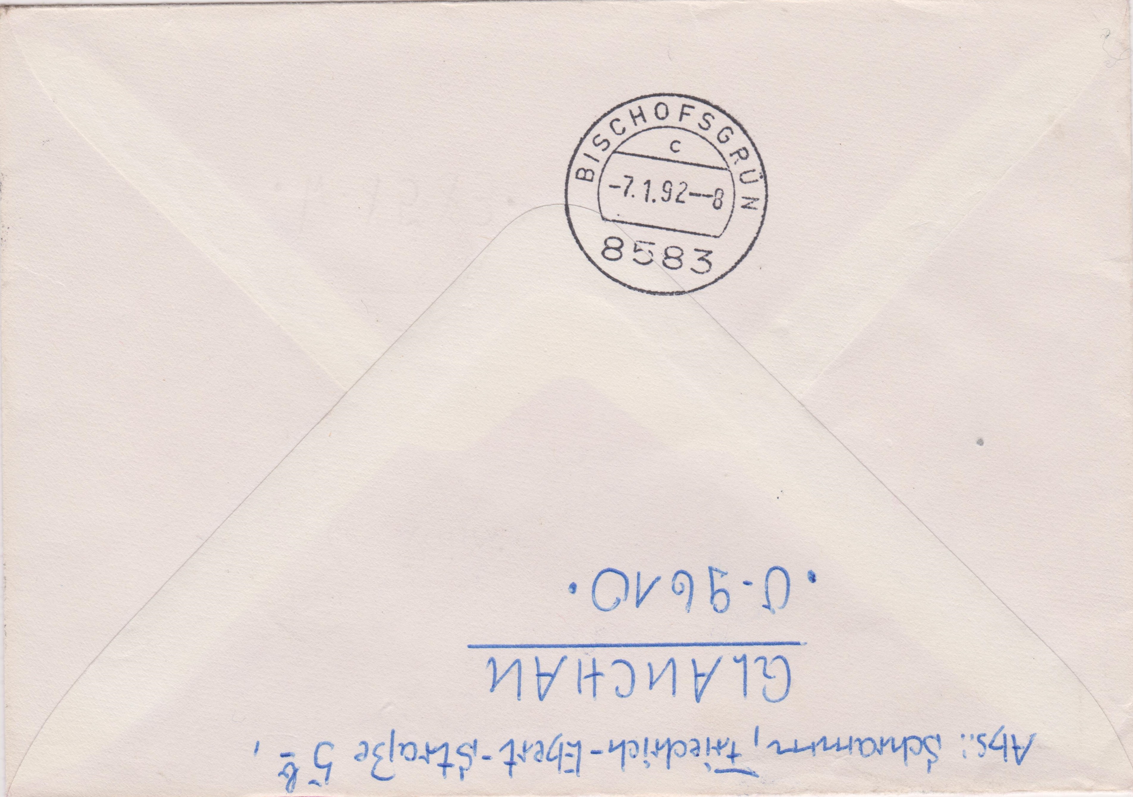 Dieser nach "W-8583 BISCHOFSGRÜN", also ins VGW, adressierte Brief wurde am 06.01.1992 um 18 Uhr in GLAUCHAU, also im VGO, aufgegeben und kam bereits am 07.01.1992 um 8 Uhr am Zielort an: