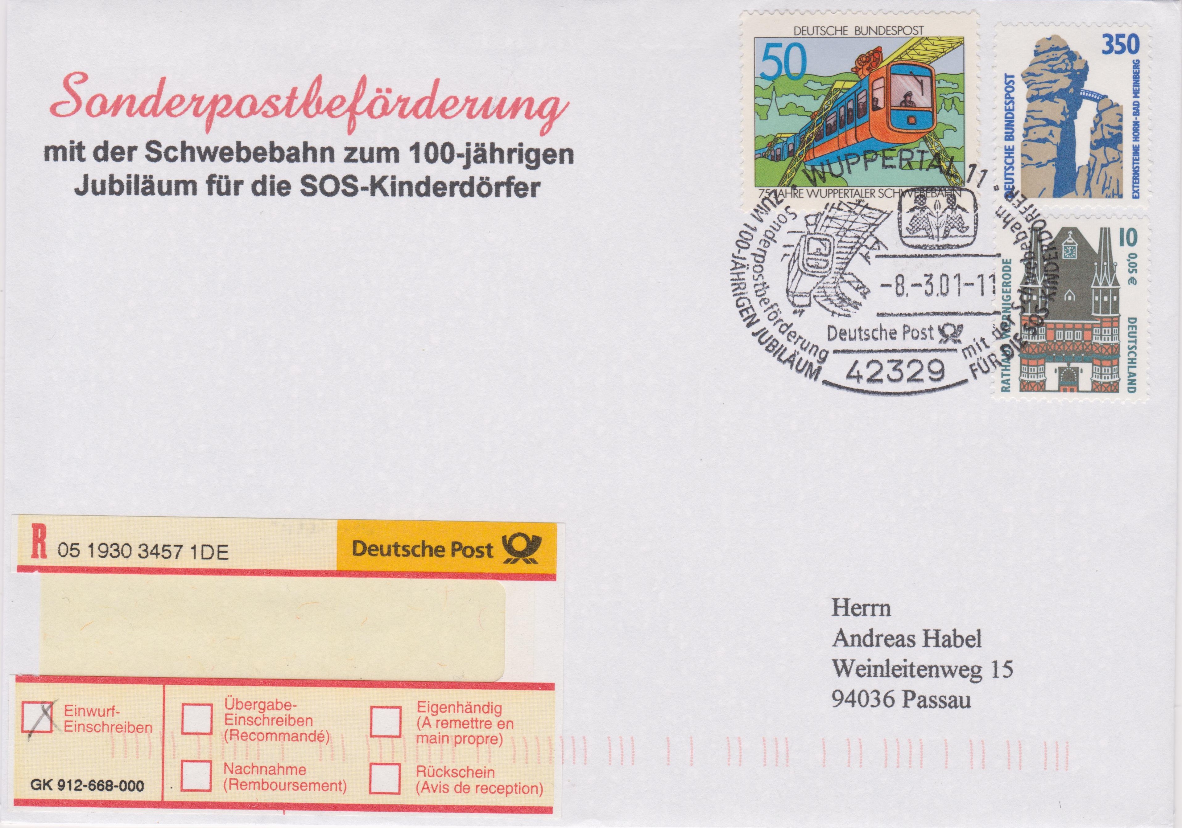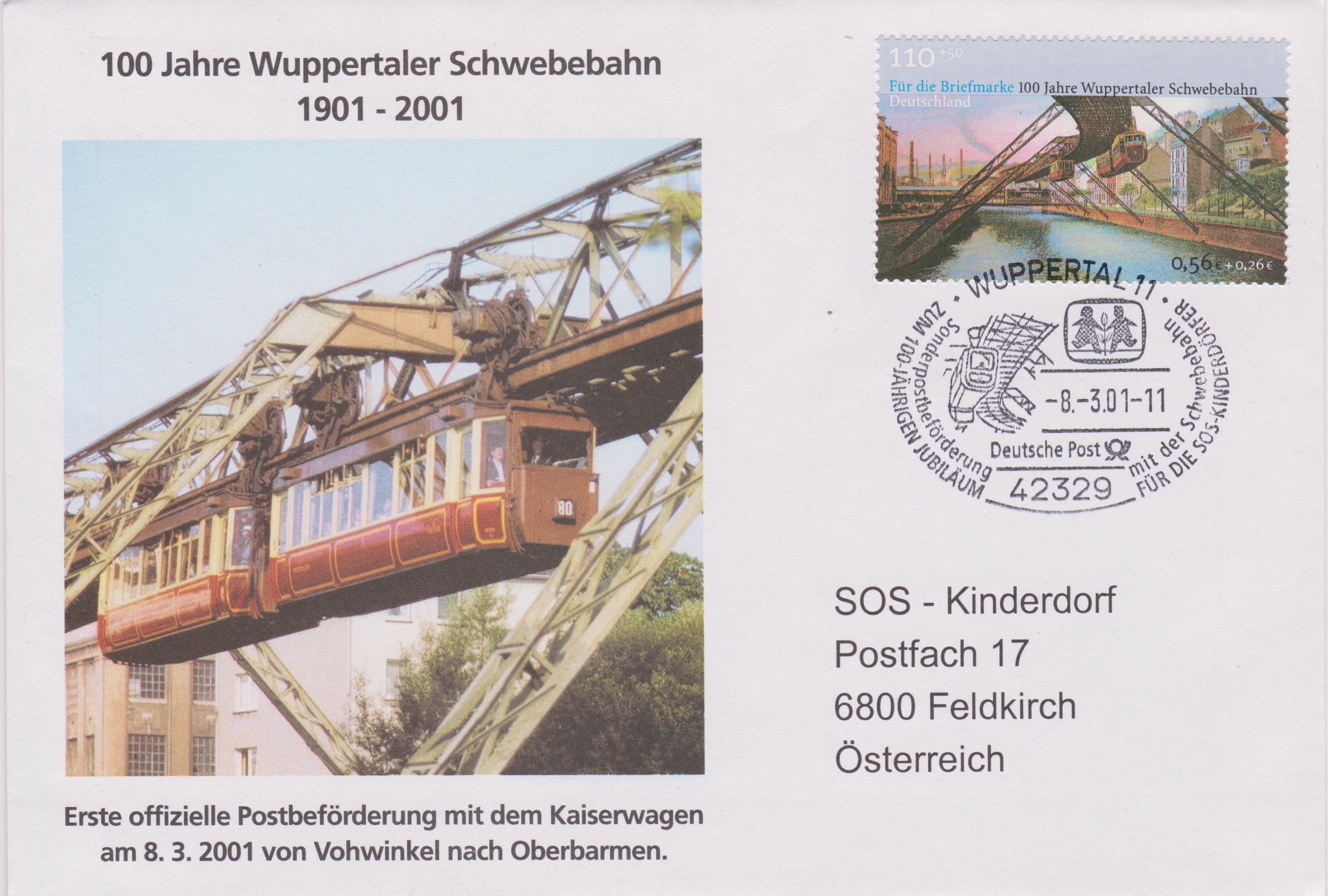 Dieser eingeschriebene Brief wurde am 08.03.2001 aus Anlaß des 100-jährigen Jubiläums mit der Schwebebahn in Wuppertal befördert: