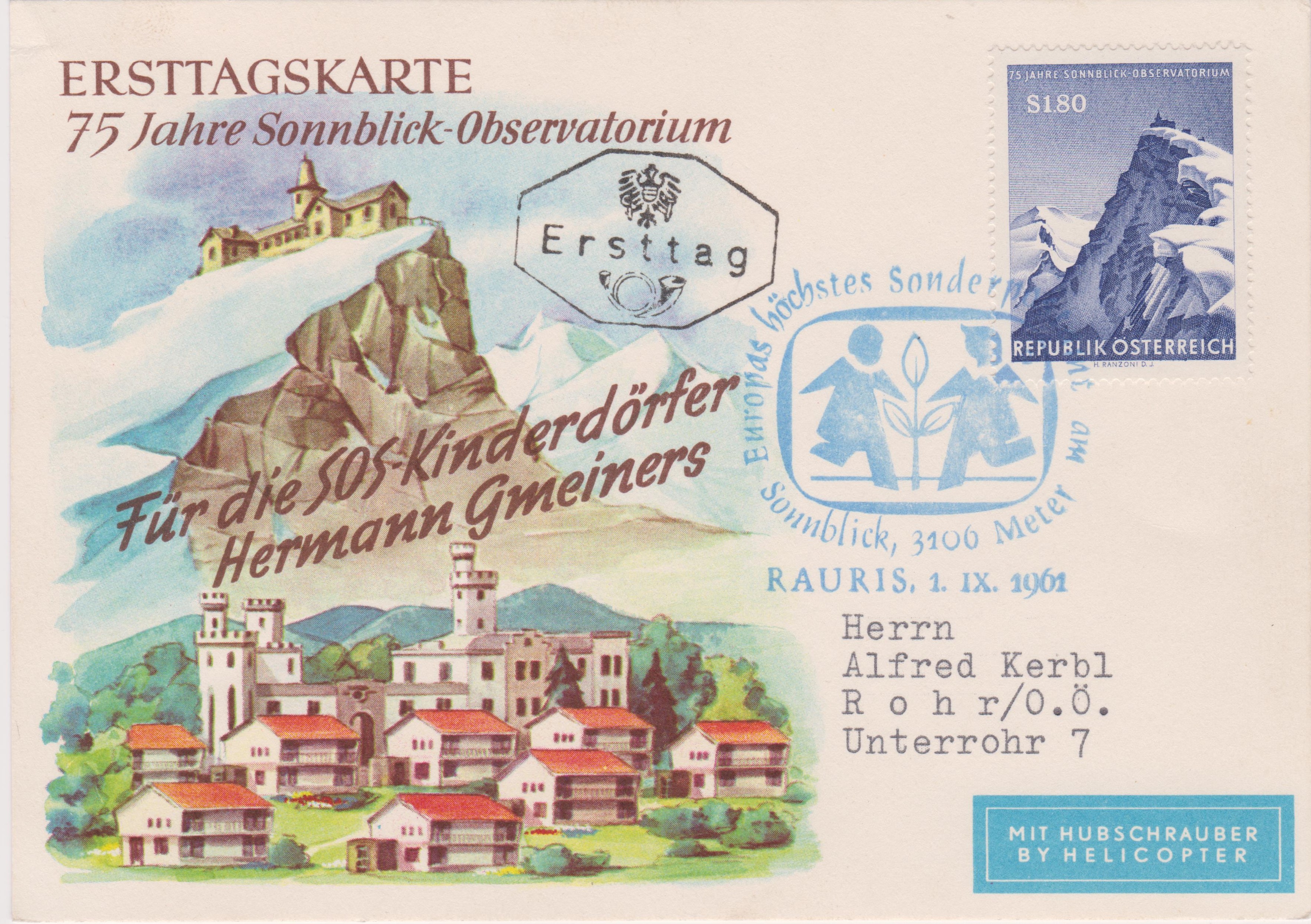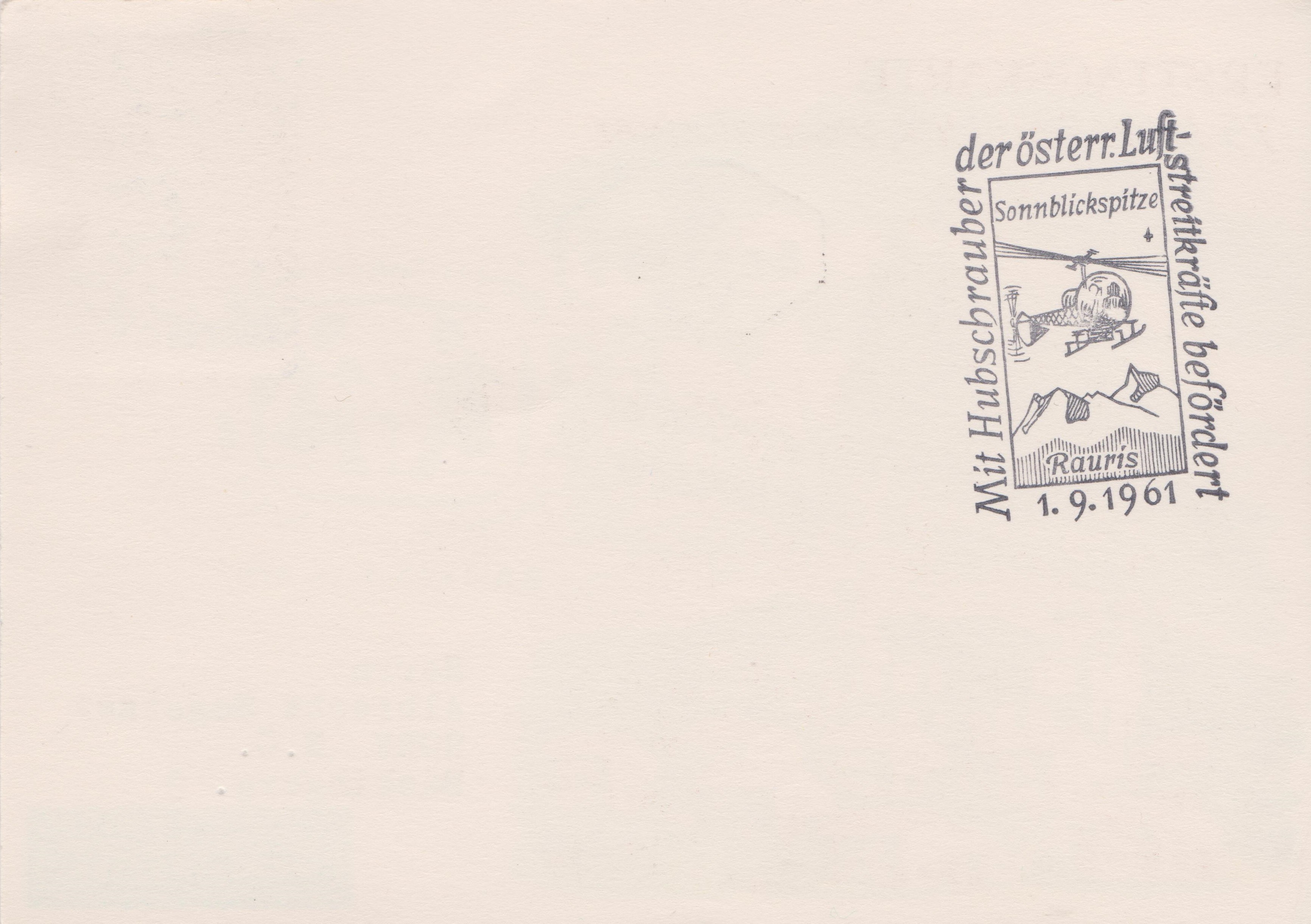 Diese "Ersttagskarte" wurde am 01.09.1961 (= Ersttag) der Sondermarke "75 JAHRE SONNBLICK-OBSERVATORIUM" per Hubschrauber von der Sonnblickspitze nach RAURIS befördert: