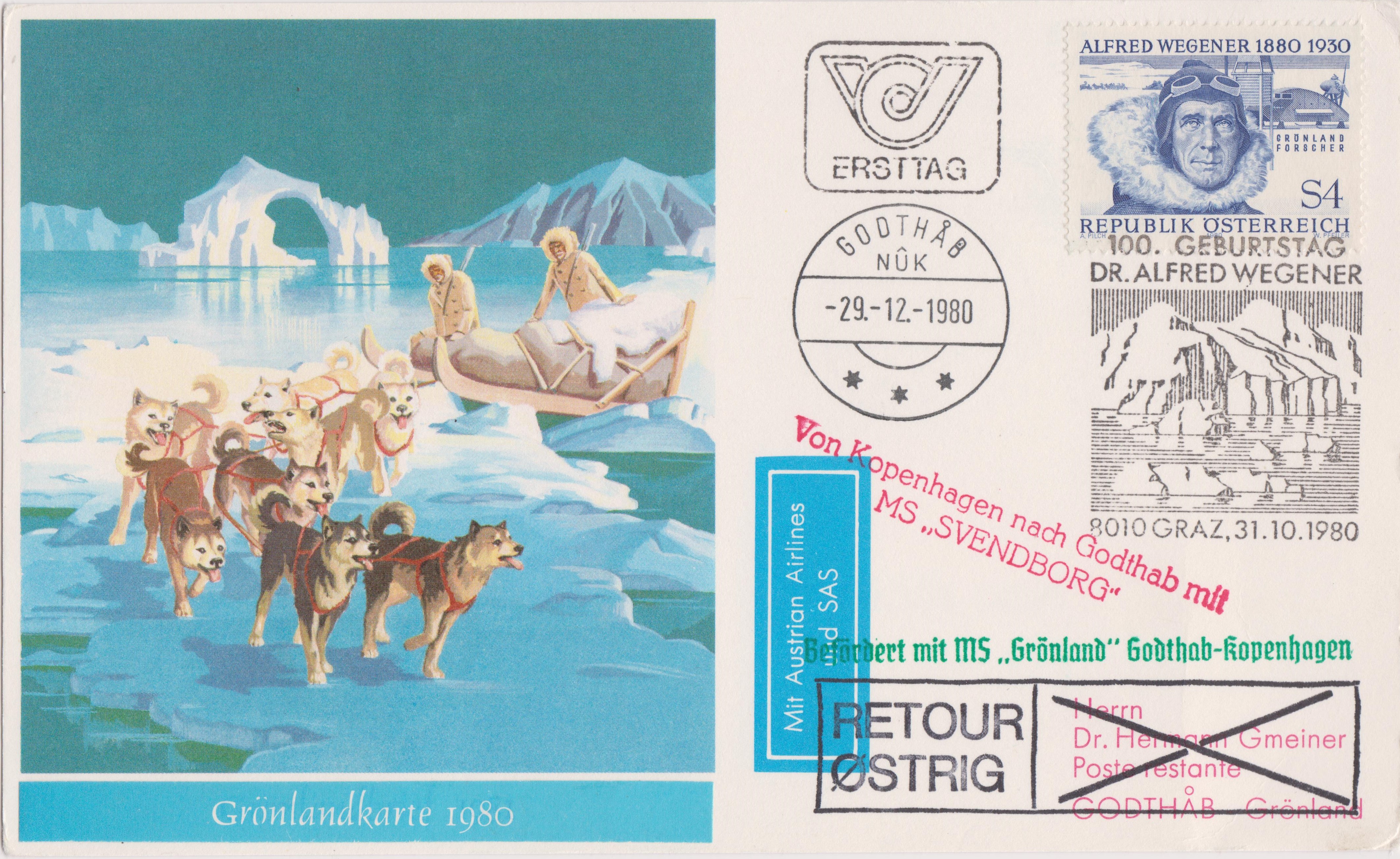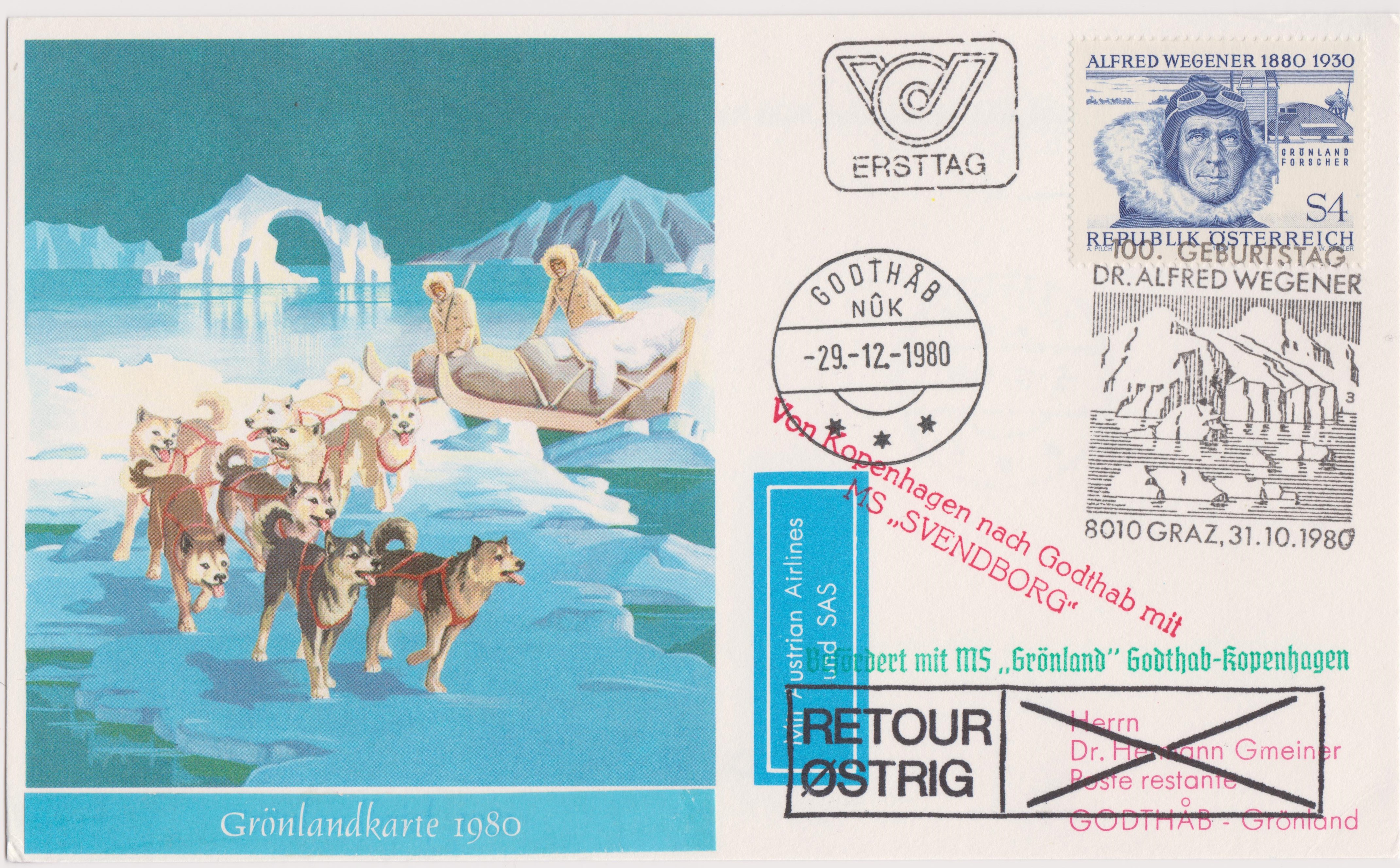 Da als Adresse eine Postlageradresse "Poste restante GODTHAB - Grönland" angegeben war wurde dieser Beleg nach GODTHAB geleitet, zunächst per Flugzeug mit Austrian Airlines und SAS nach Kopenhagen und dann per Schiff mit "MS SVENDEBORG" von Kopenhagen nach Godthab.