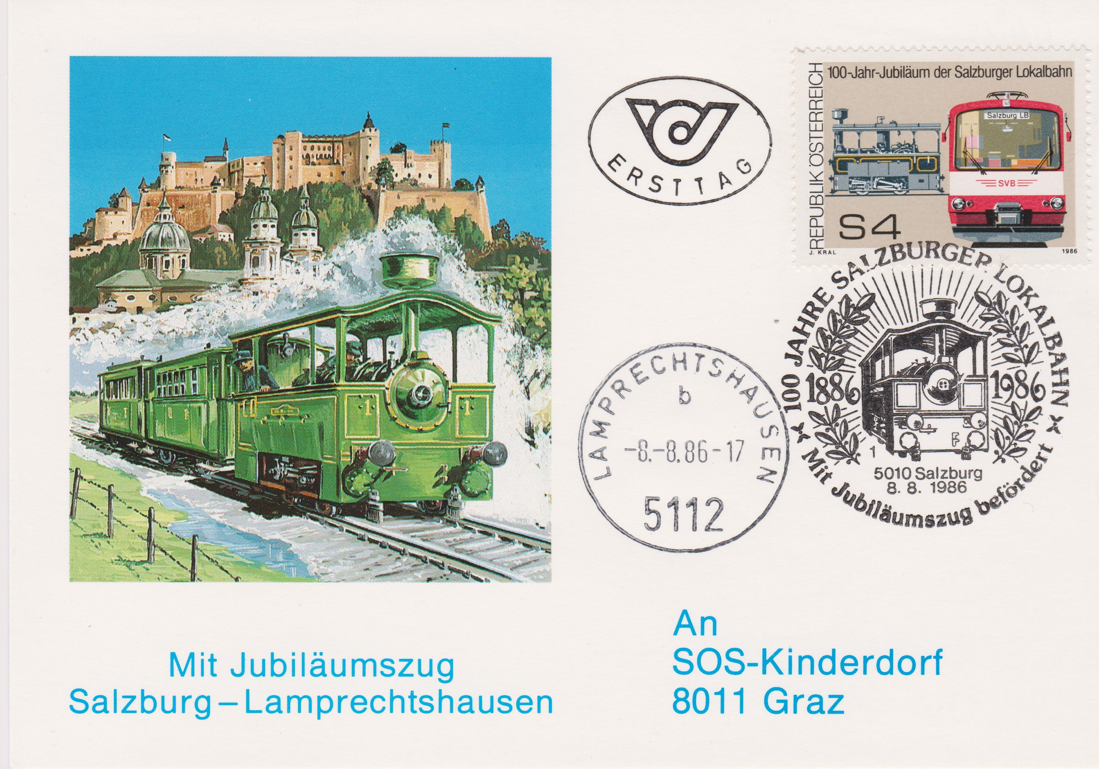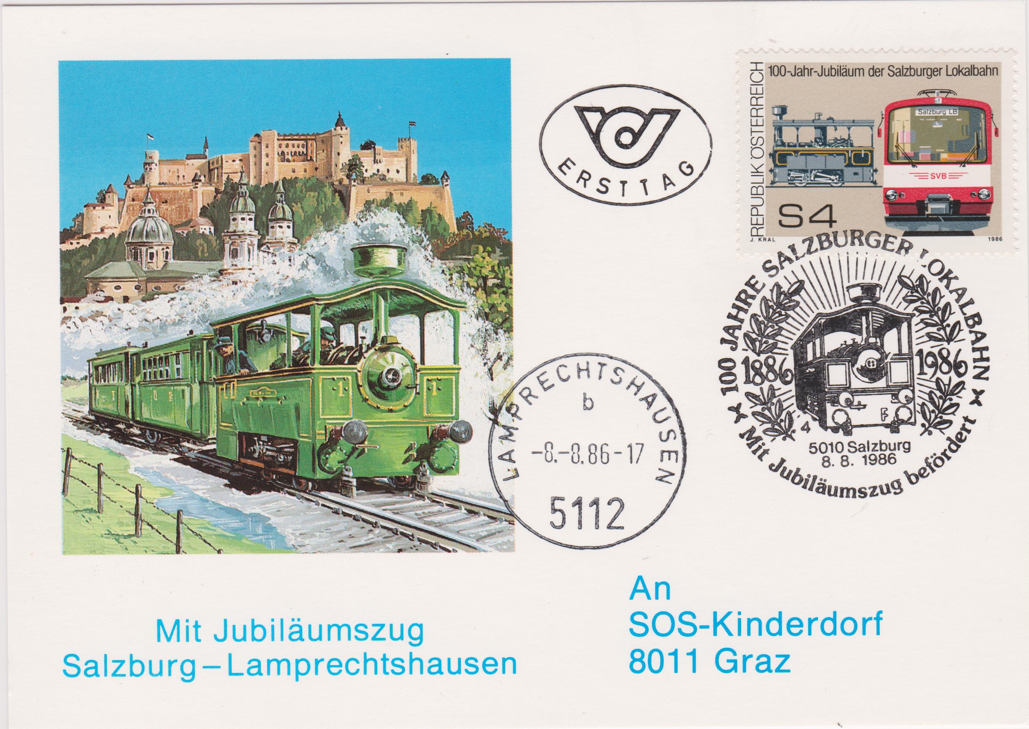 Diese Postkarte wurde am 08.08.1986 (= Ersttag) "Mit Jubiläumszug Salzburg - Lamprechtshausen" befördert: