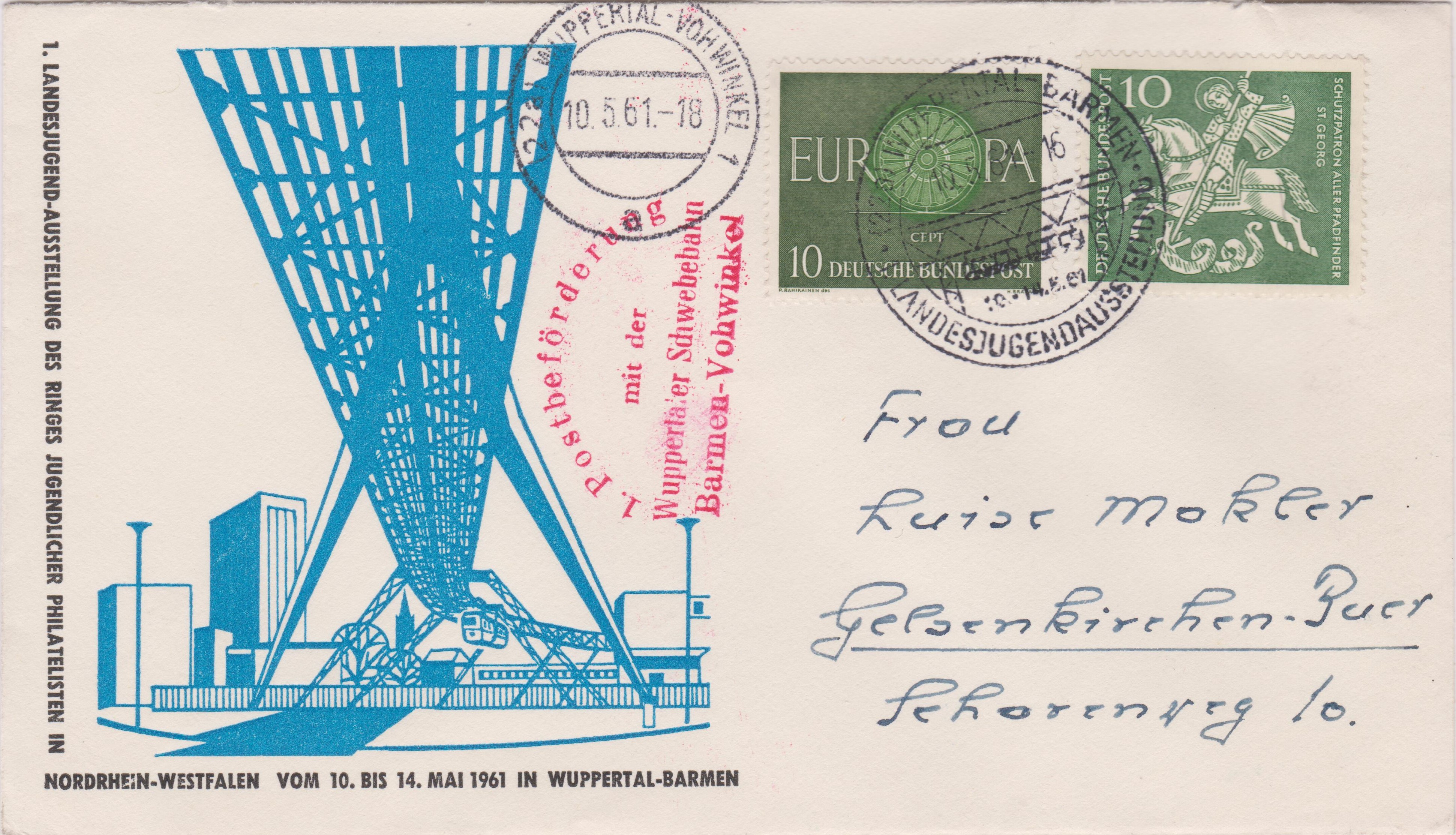 Die 1. Postbeförderung mit der Wuppertaler Schwebebahn erfolgte am 10.05.1961 von WUPPERTAL-BARMEN nach WUPPERTAL-VOHWINKEL. Hier zwei Briefe von dieser 1. Postbeförderung: