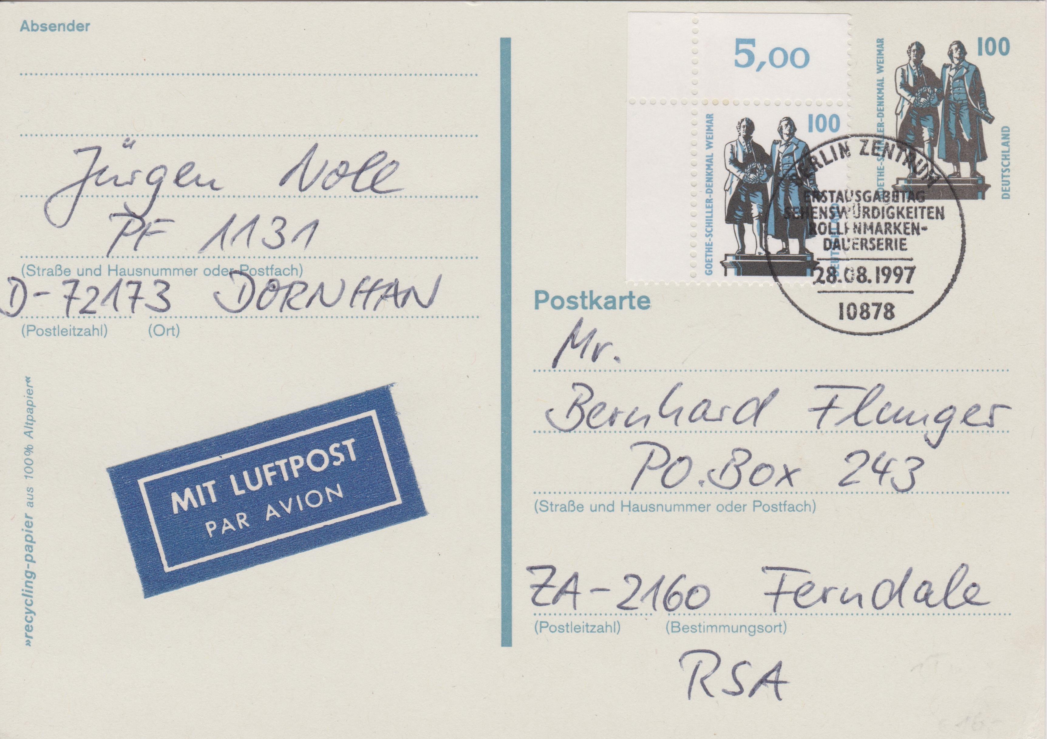 Ganzsache mit eingedruckter Wertstufe 100 (Pf) der Dauerserie Sehenswürdigkeiten mit bildgleicher Zusatzfrankatur in Form einer linken oberen Bogenecke des Zehnerbogens, entwertet per Ersttagsstempel BERLIN, gelaufen nach Südafrika: