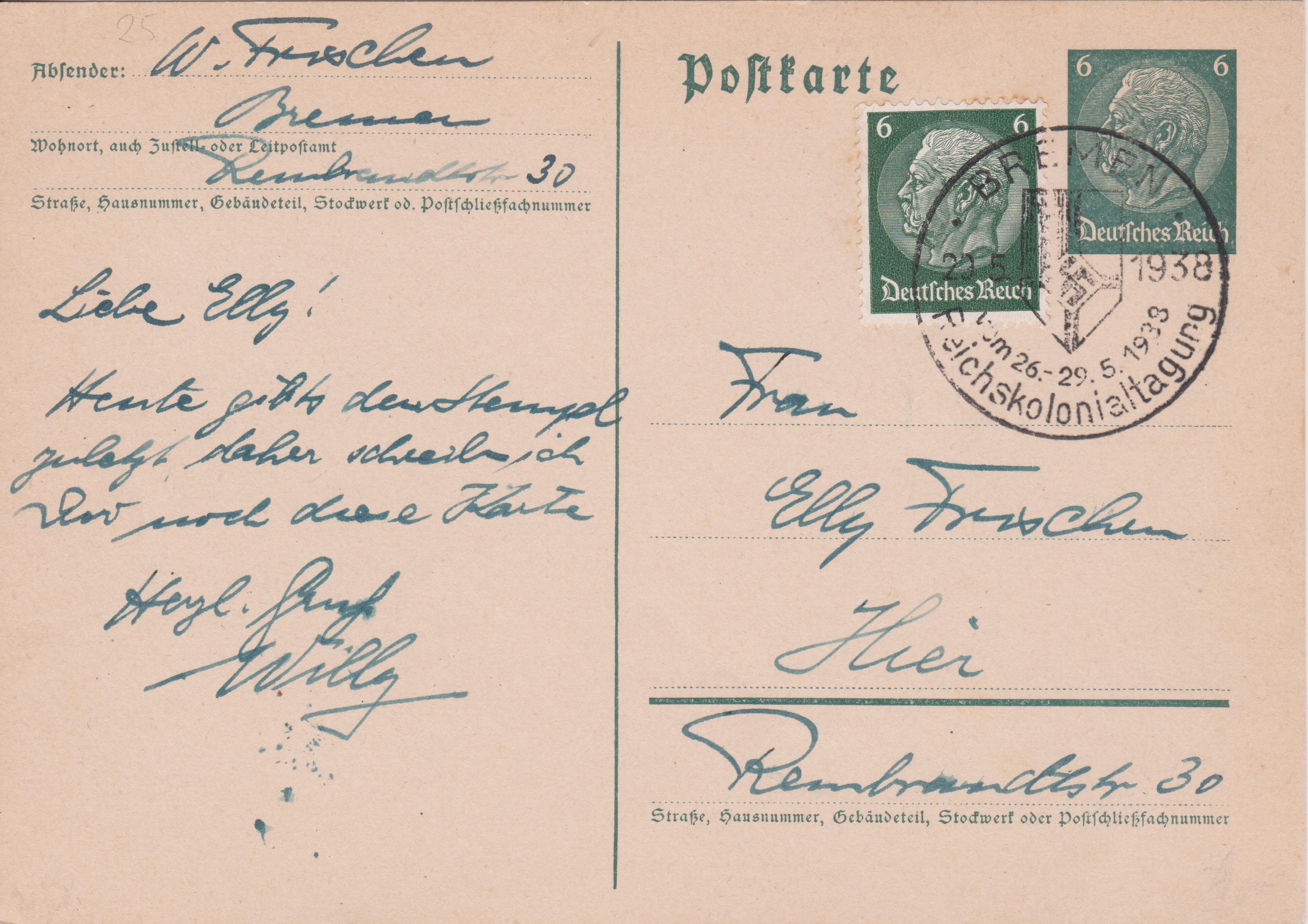 Postkarte mit engedrucktem Postwertzeichen 6 Pf Dauerserie Hindenburg-Medaillon sowie bildgleicher Zusatzfrankatur, gelaufen am 29.05.1938 im Ortsverkehr von BREMEN zur Dokumentation des Letzttags dieses Sonderstempels: