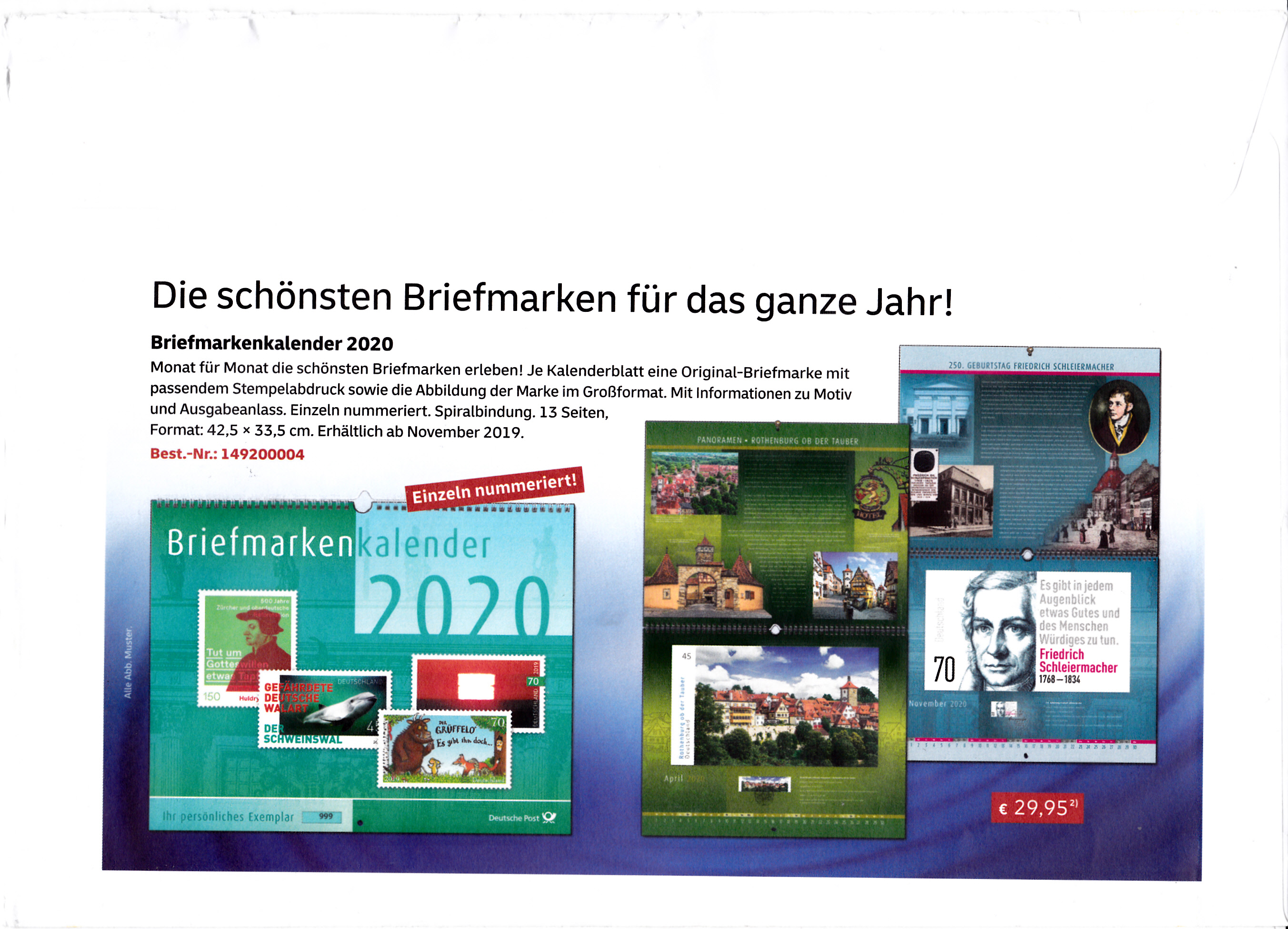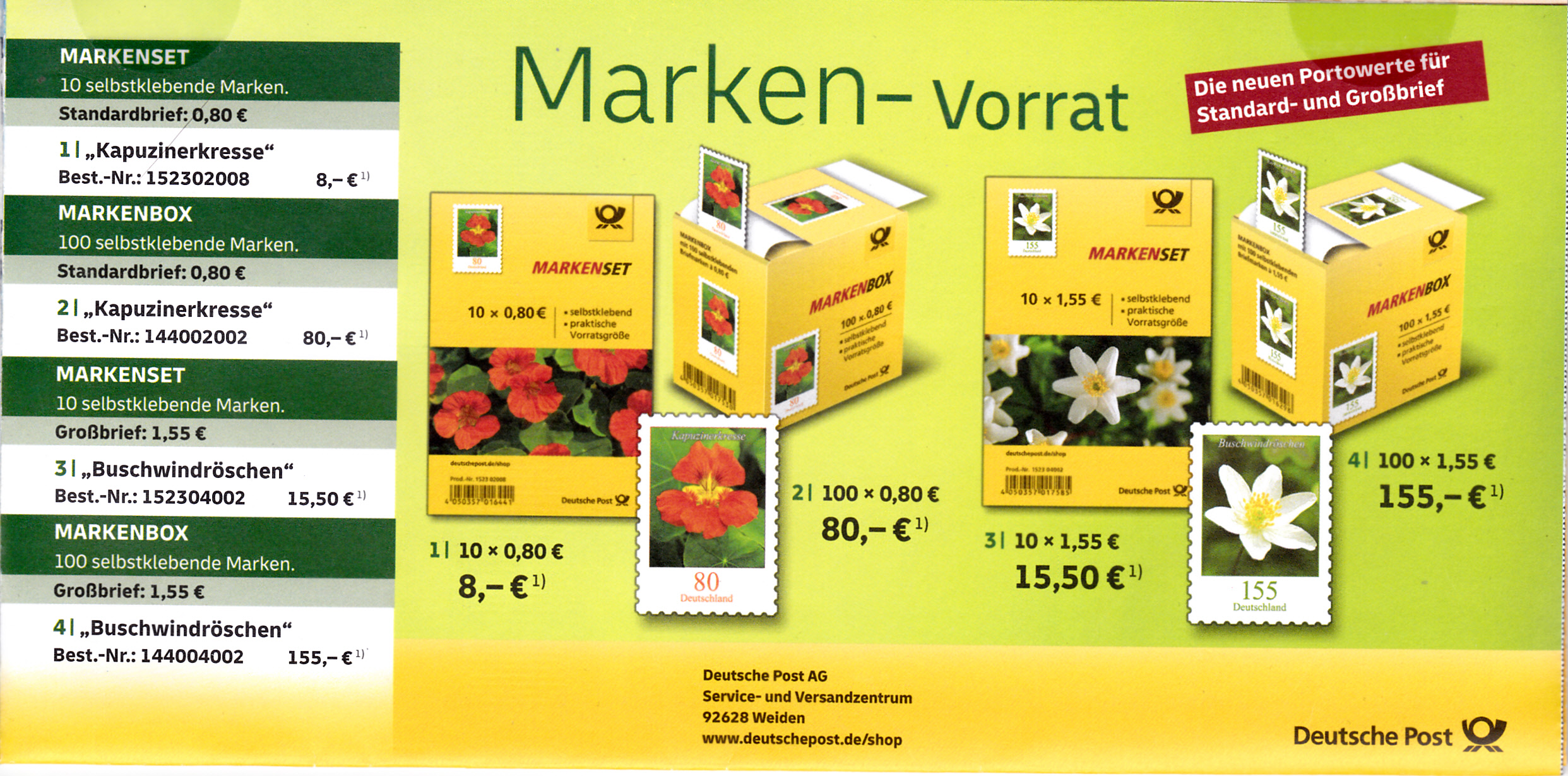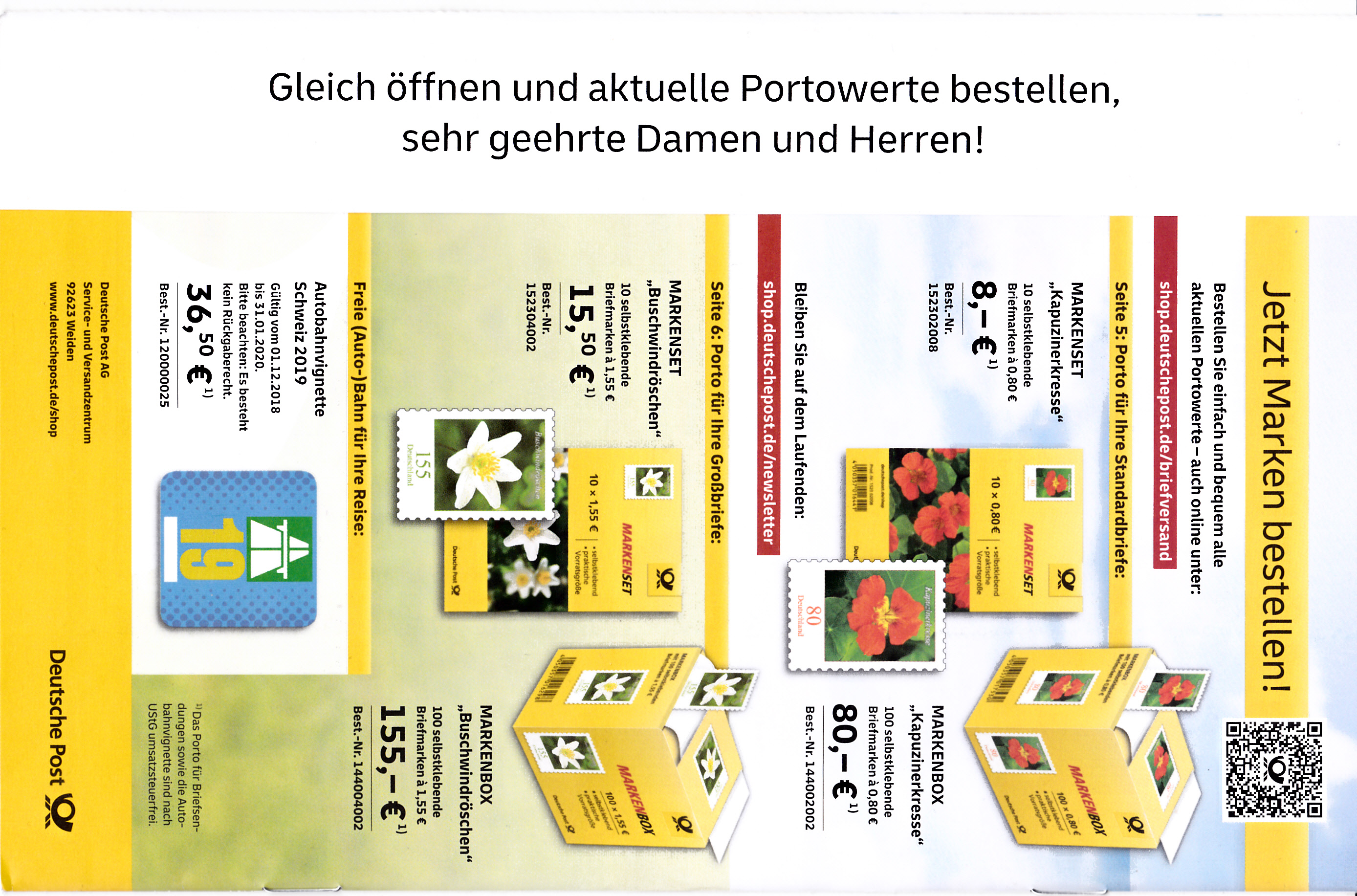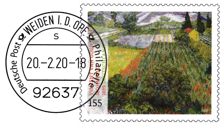 Diese Broschüre im Format 235 x 152 mm (unten geheftet) hat einen Wertstempel mit der 155 Cent Marke (MiNr 3512) mit dem Gemälde "Mohnfeld" von Vincent van Gogh aus der Serie "Schätze aus deutschen Museen" mit aufgedruckter Zähnung und Vorausentwertung "Deutsche Post (Posthorn) WEIDEN I.D.OPF (Posthorn) Philatelie/ s / 20.-2.20-18".